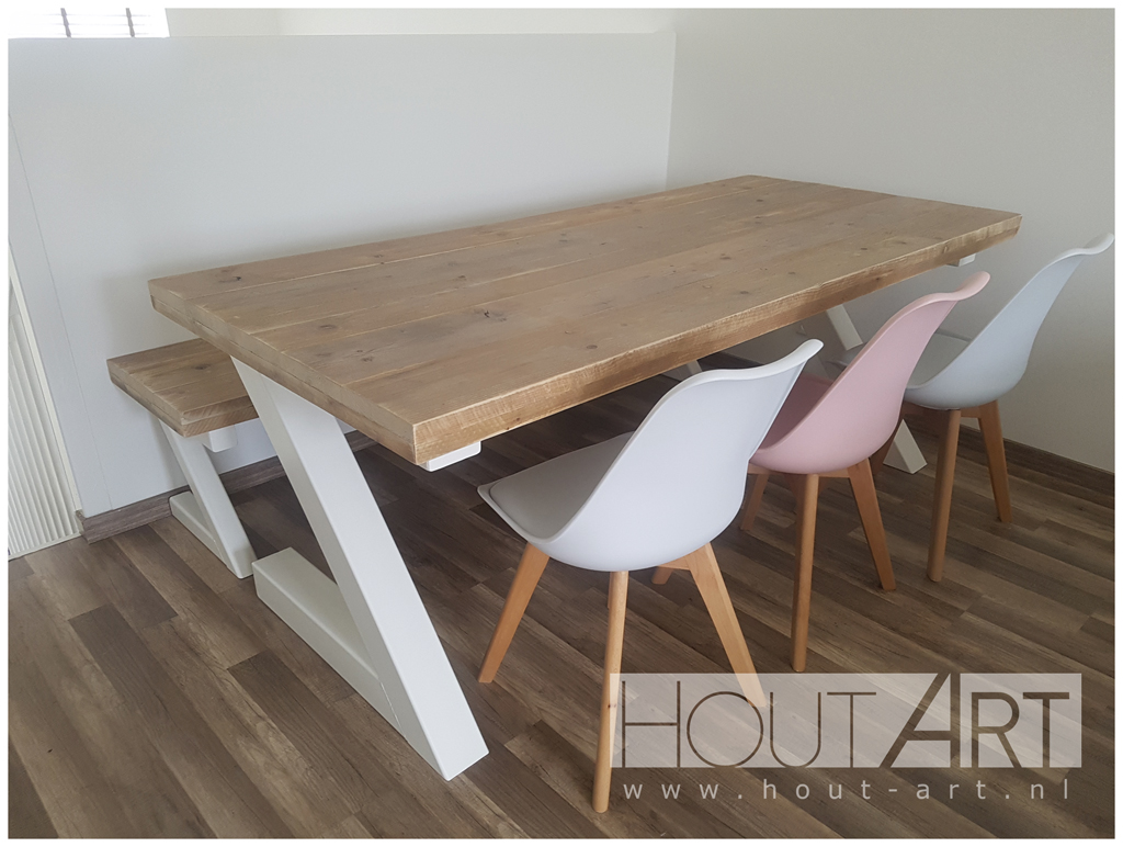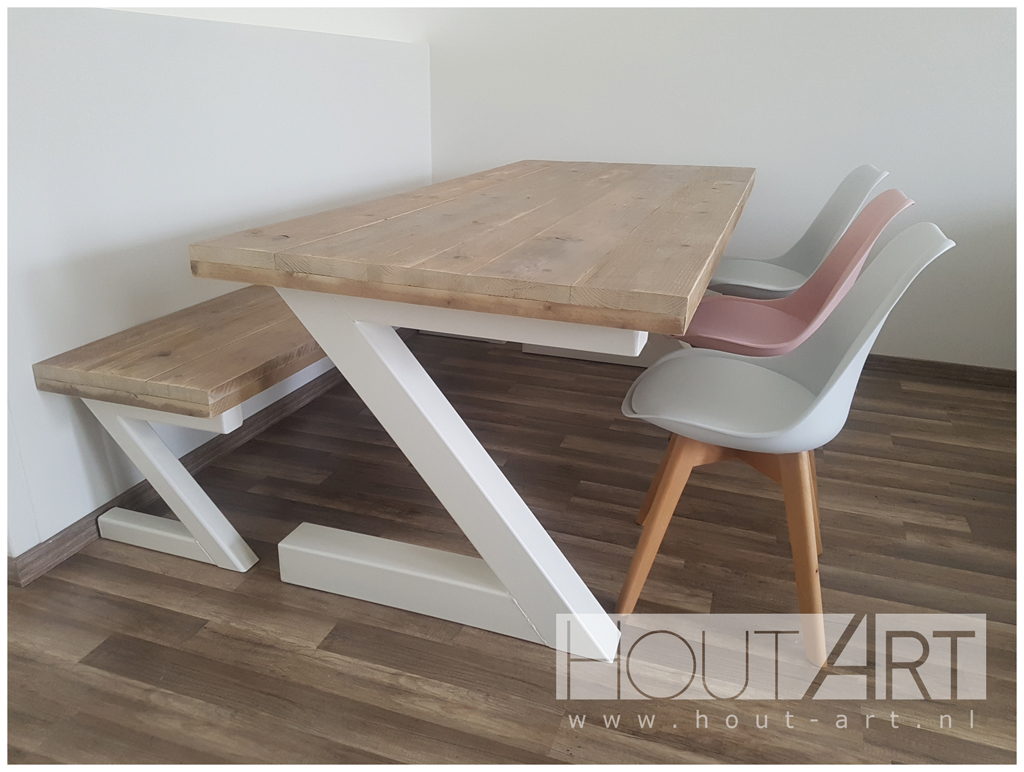 Ga voor industrieel met deze luxe bank met stalen Z-poten in koker 60x60mm, of in 80x80mm voor een robuustere uitstraling. De zitting met verdikte rand kan in nieuw of gebruikt steigerhout, met gebruikt hout krijgt je meubel een robuustere look.