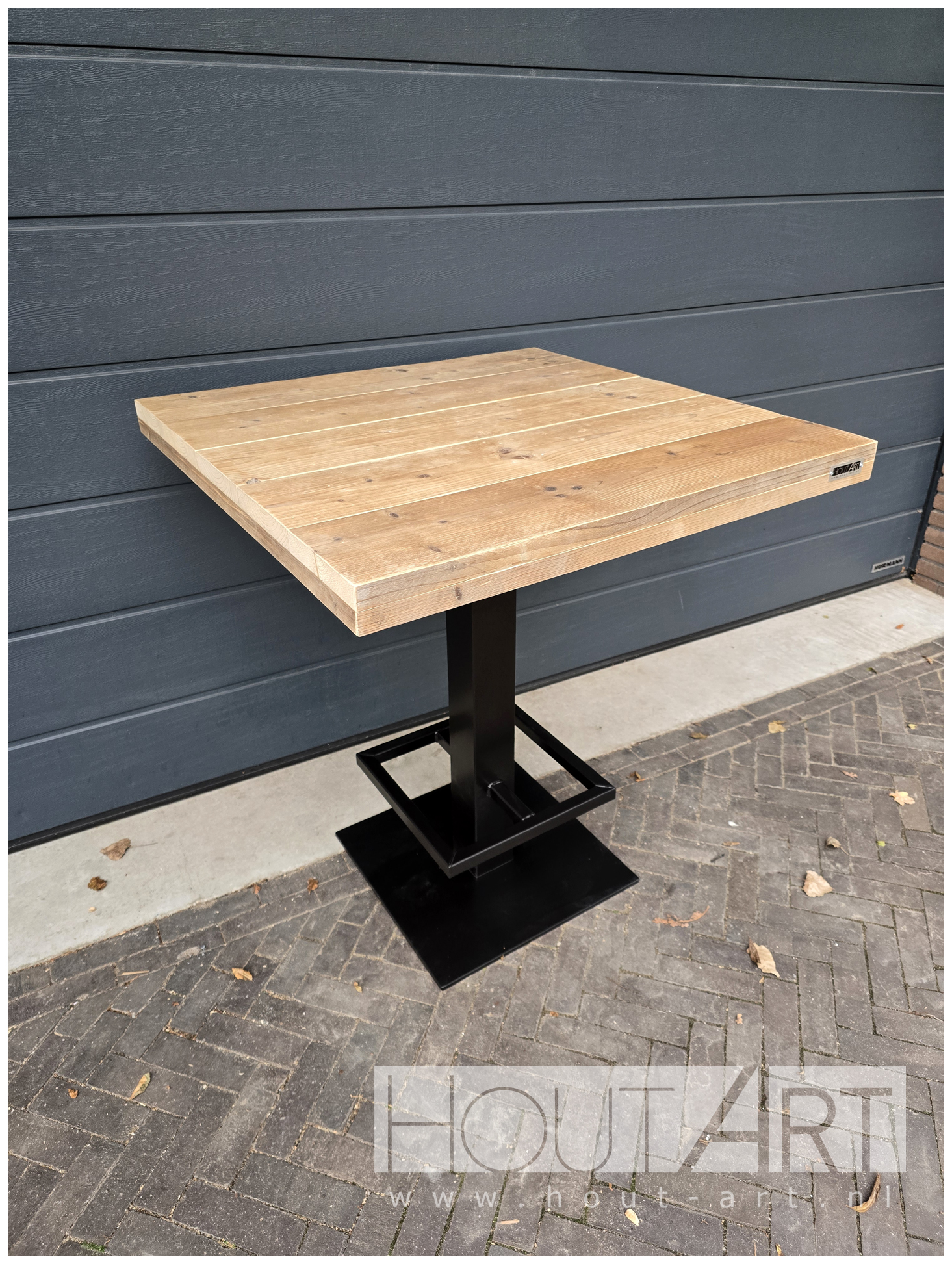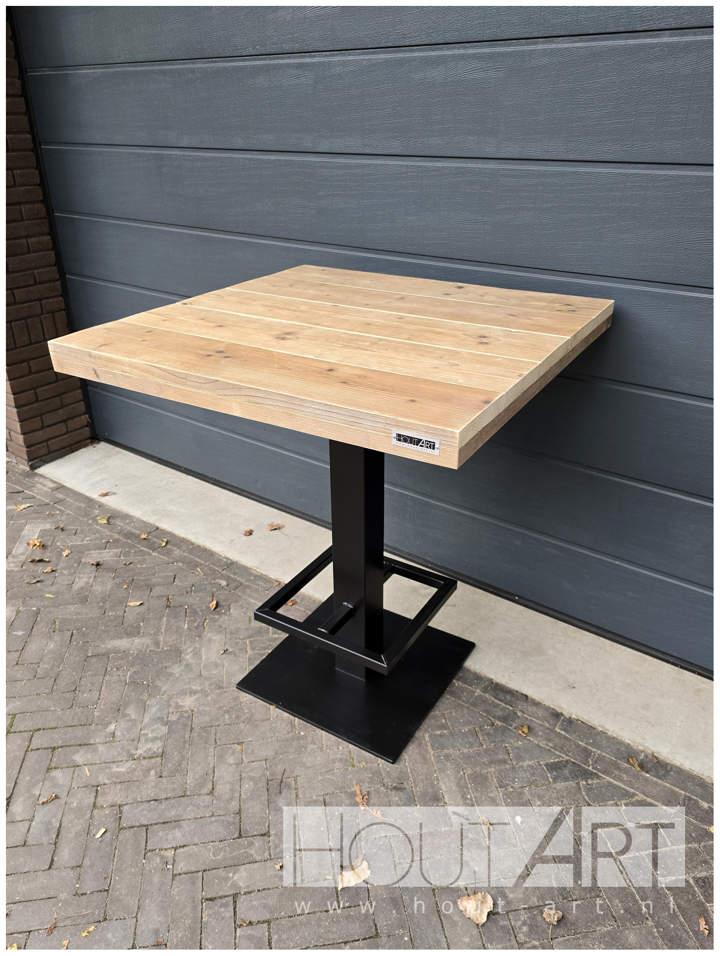 Deze industriële bartafel is een stijlvolle en functionele toevoeging aan je interieur. Gemaakt van een robuuste stalen kolompoot in de afmetingen van 80x80mm of 100x100mm, biedt deze tafel stabiliteit en een moderne uitstraling. Het blad is gemaakt met een verdikte rand van steigerhout, dat gemaakt kan worden in zowel nieuw als gebruikt steigerhout. Kies voor gebruikt steigerhout als je op zoek bent naar een meer robuuste en karaktervolle uitstraling.