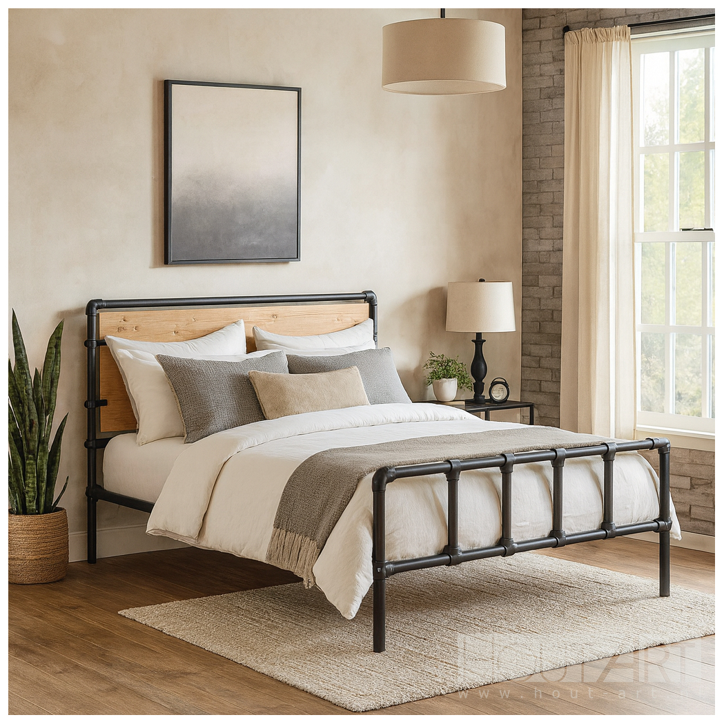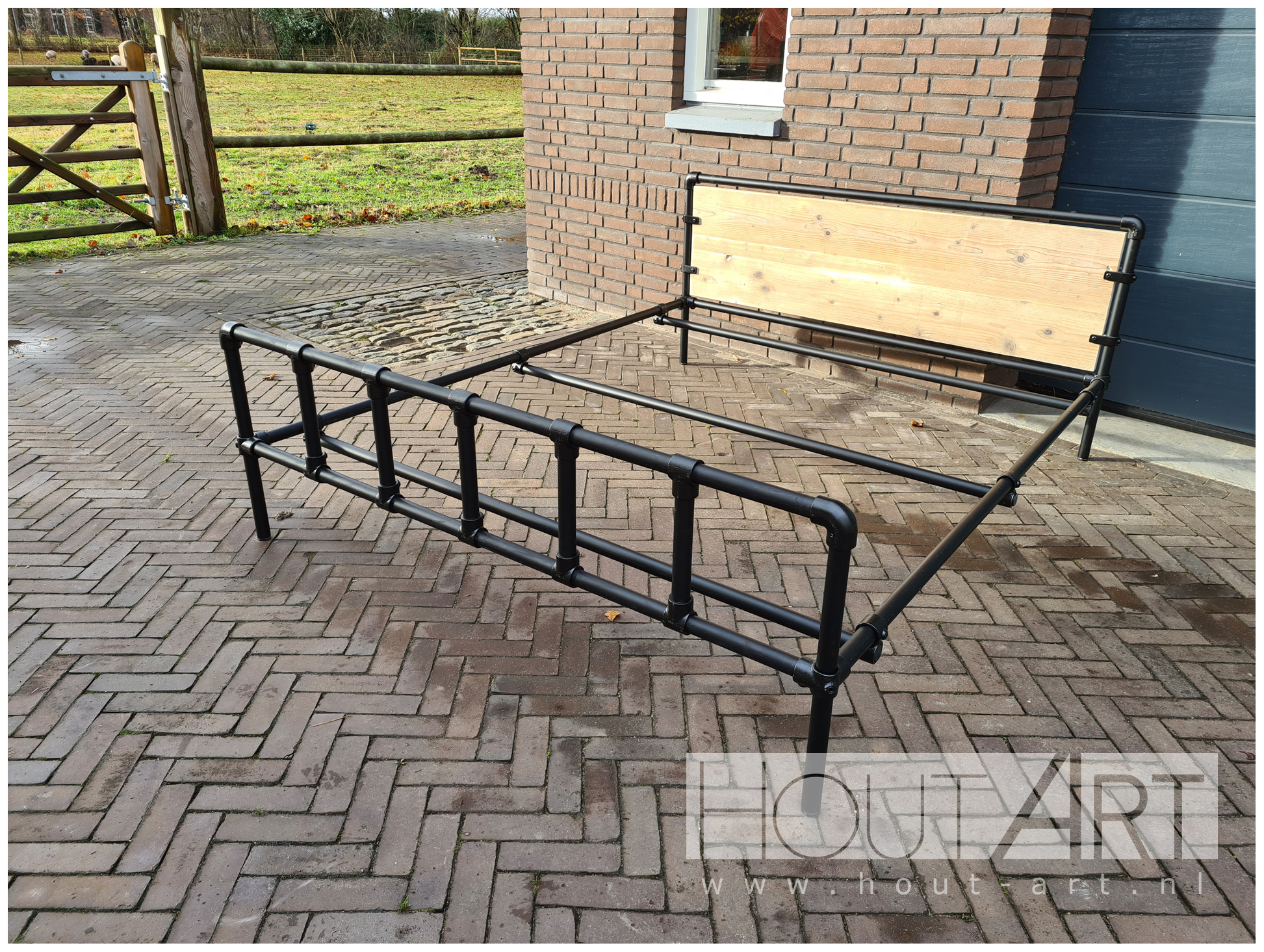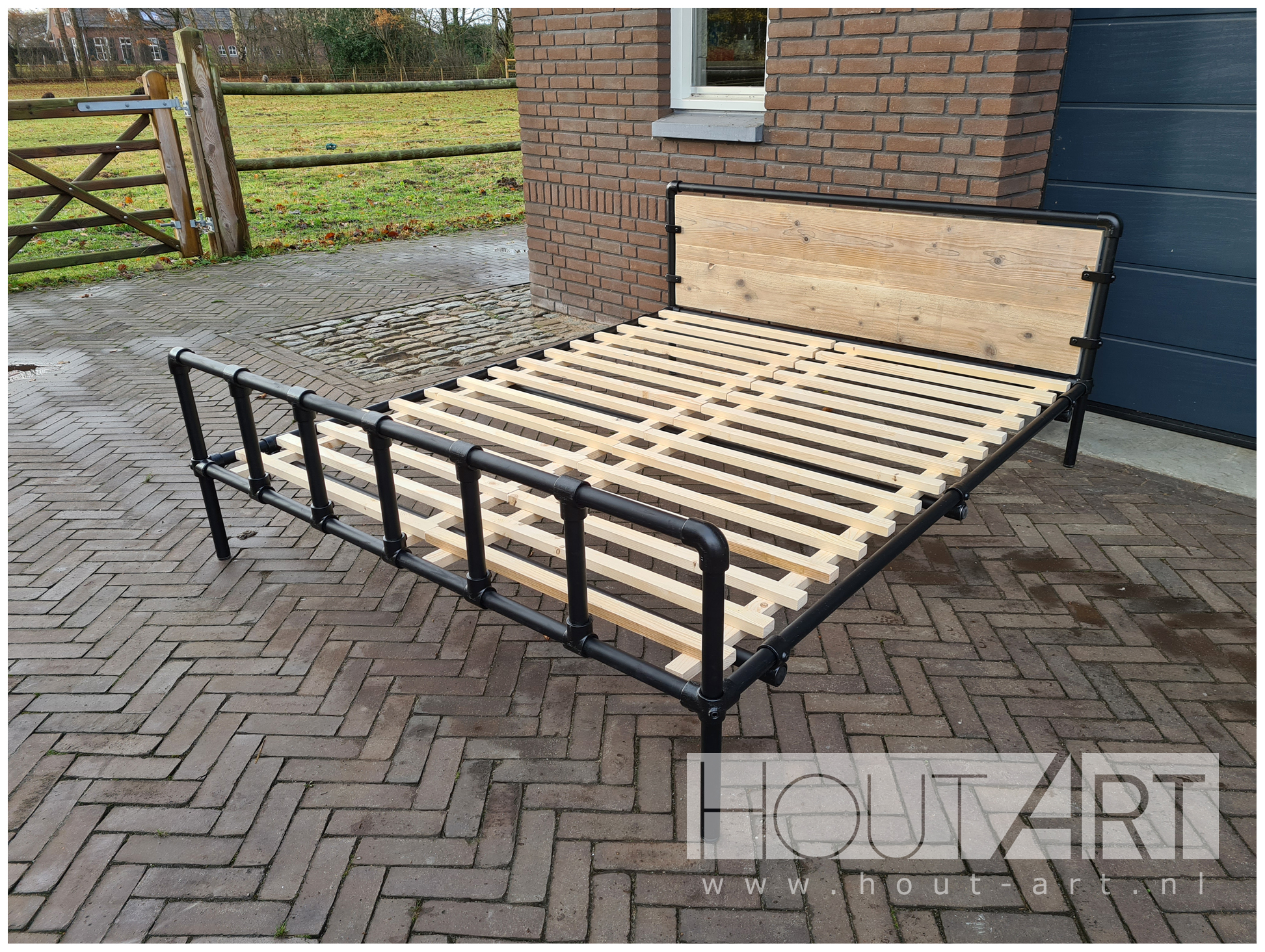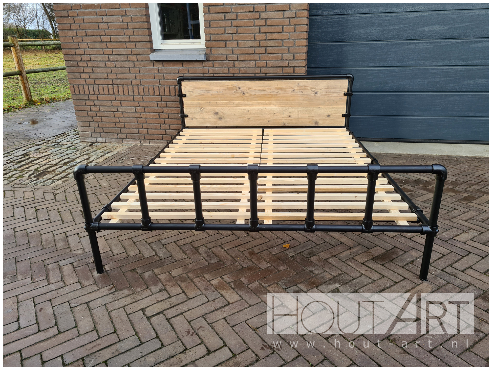 Bed frame zwarte steigerbuis met steigerhouten hoofdbord