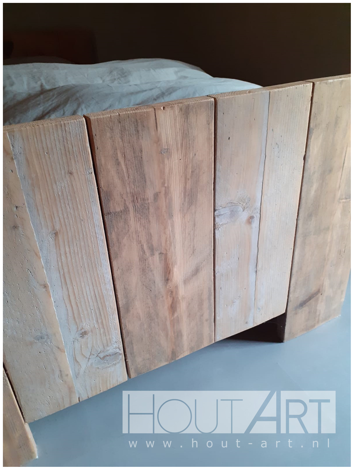 Een eenpersoonsbed, gemaakt van steigerhout met hoog hoofdbord en voeteneinde, wat het bed een luxe en robuuste uitstraling geeft.