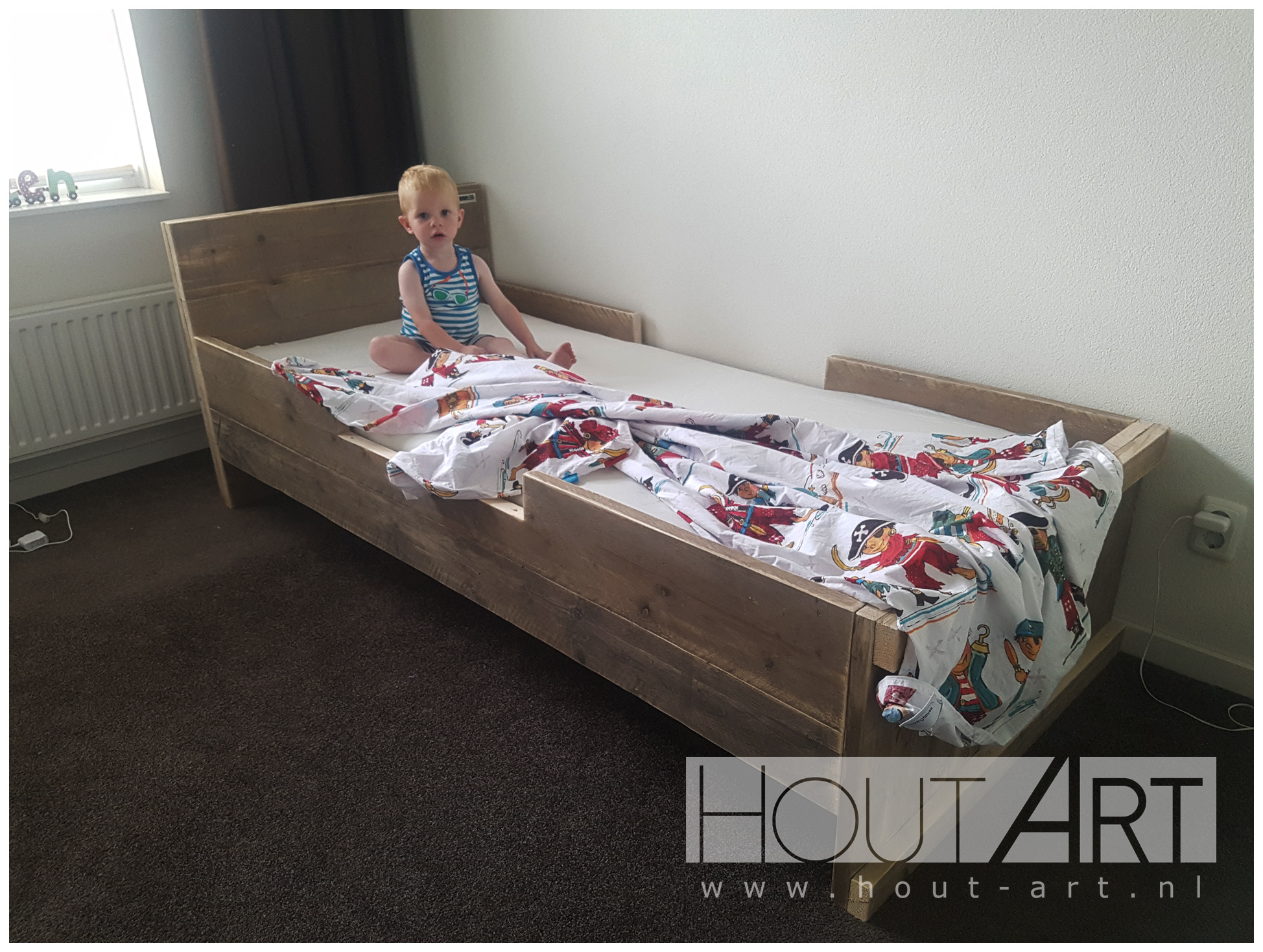 Landelijk eenpersoonsbed, volledig gemaakt van steigerhout met hogere zijkanten zodat ook kleinere kinderen niet uit het bed kunnen rollen.