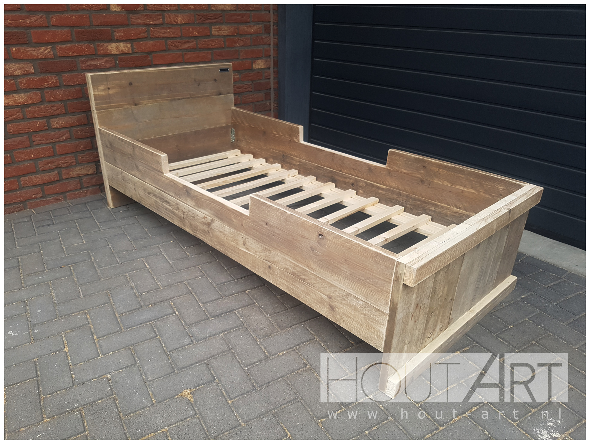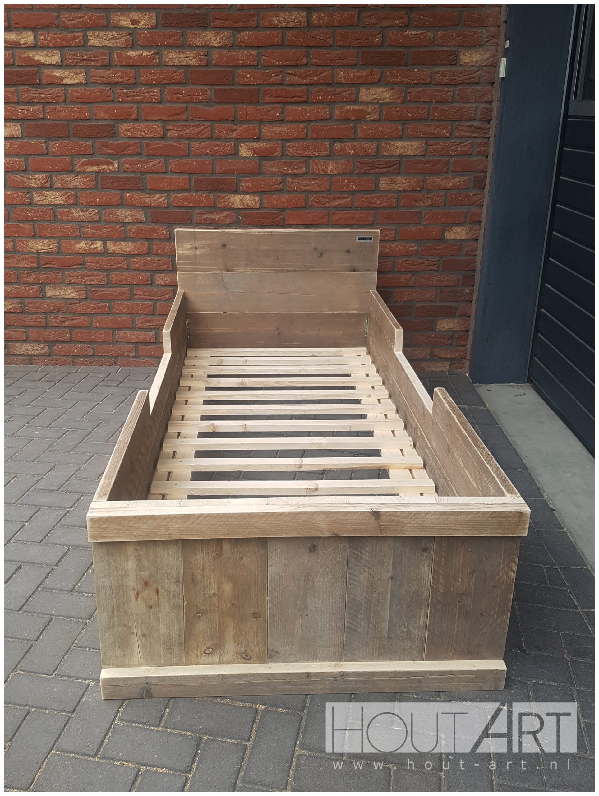 Een eenpersoonsbed, gemaakt van steigerhout met hoge randen en lagere instap.