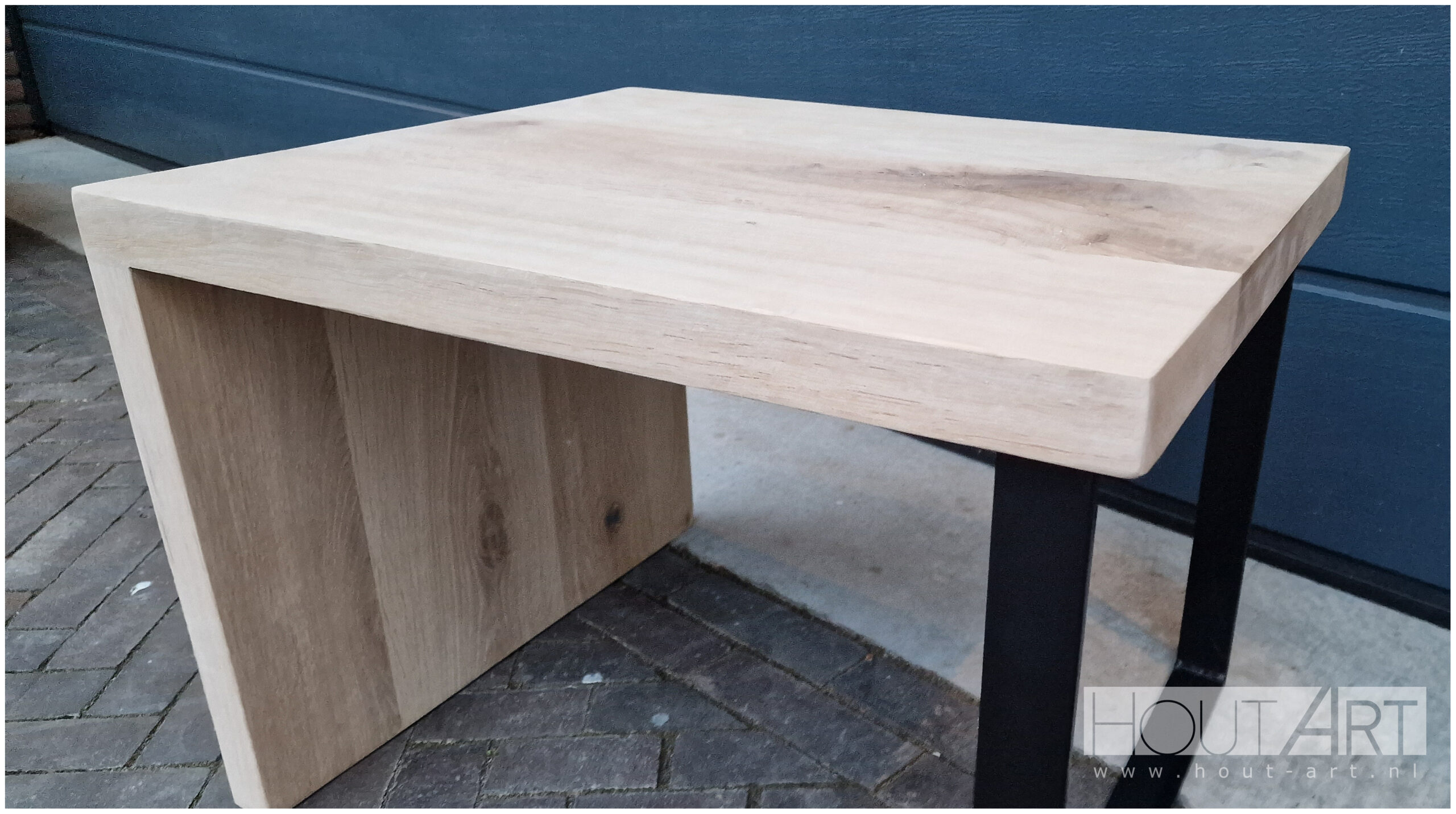Deze industriële en luxe bijzettafel is een stijlvolle en functionele toevoeging aan je interieur. De tafel is gemaakt van eikenhout met aan één zijde een stalen strippoot en de andere zijde loopt het eiken door waardoor er een soort l-vorm ontstaat, daardoor krijgt de tafel een luxe maar ook moderne uitstraling. Het blad is gemaakt eiken, kies daarbij ook de behandeling van het hout.