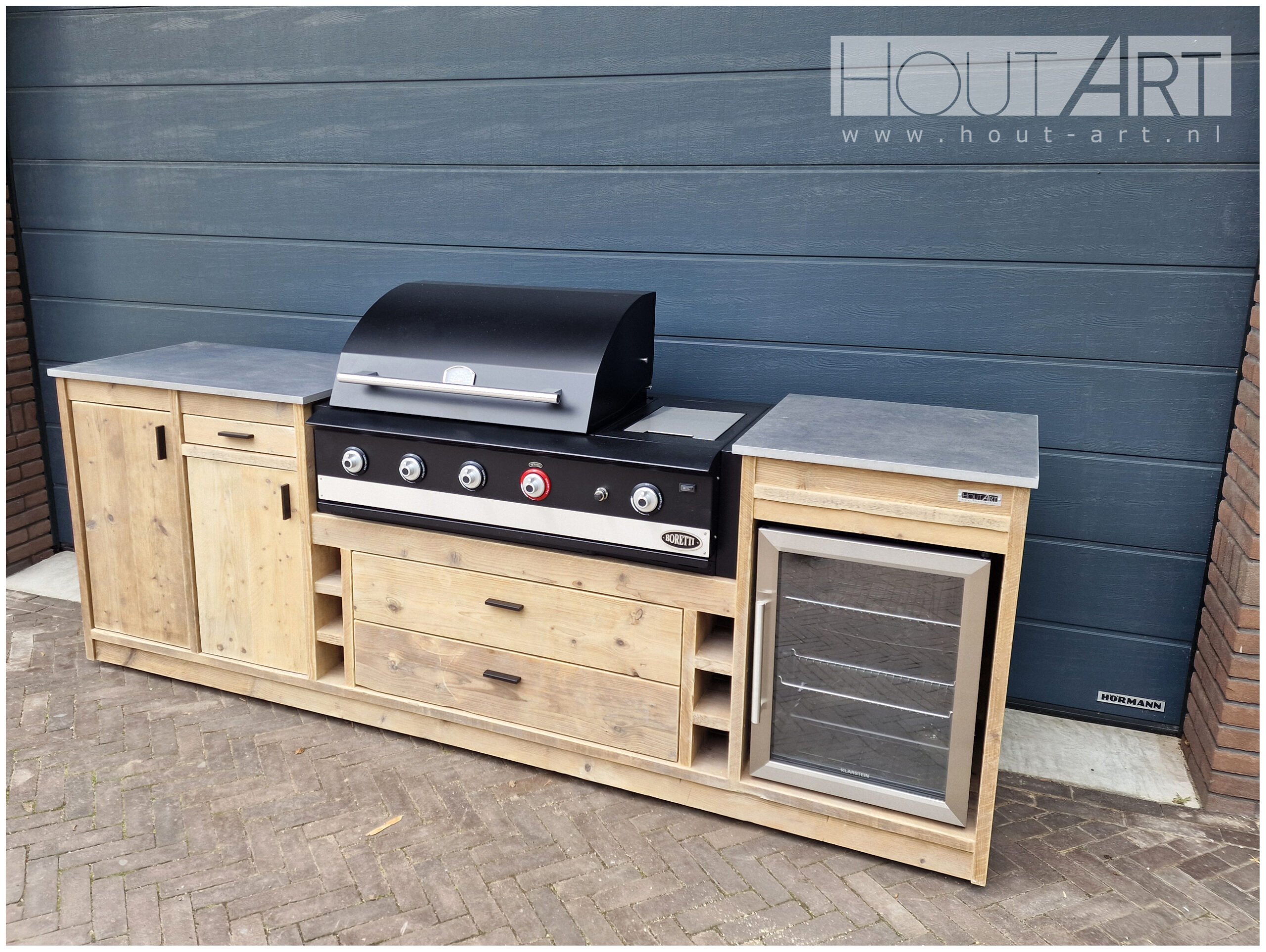 Een luxe XL steigerhouten buitenkeuken met koelkast en wijnvakken voor de ’top of the bill’, de Boretti Ibrido Top of de Boretti Ligorio Top. Laat de perfecte barbecue-avonden maar beginnen!