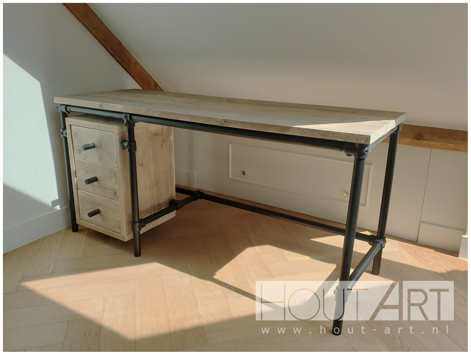 Een industrieel bureau van nieuw of gebruikt steigerhout en zwarte steigerbuis met hangend kastje!