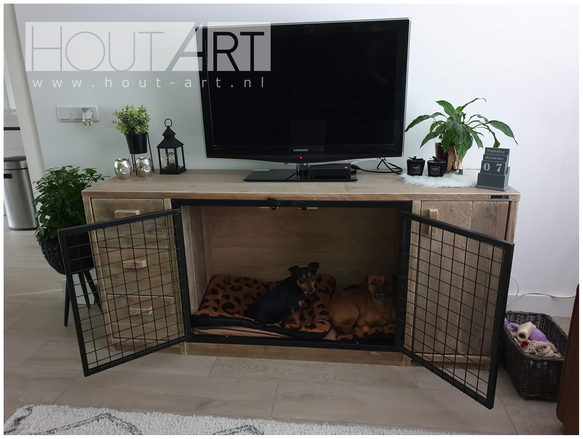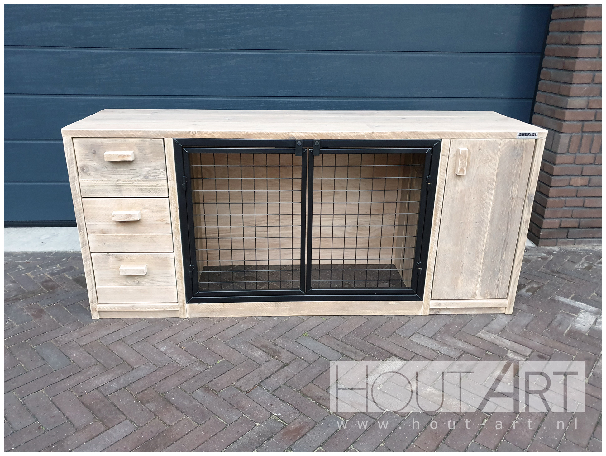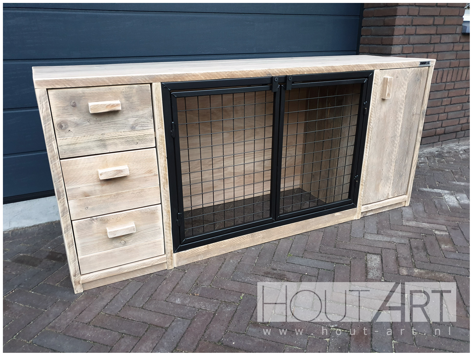 Stoere en industriële kast / dressoir in steigerhout met in het midden een extra brede ingebouwde bench voor je huisdier(en). In verschillende opties en afmetingen mogelijk, wij maken het voor je op maat!