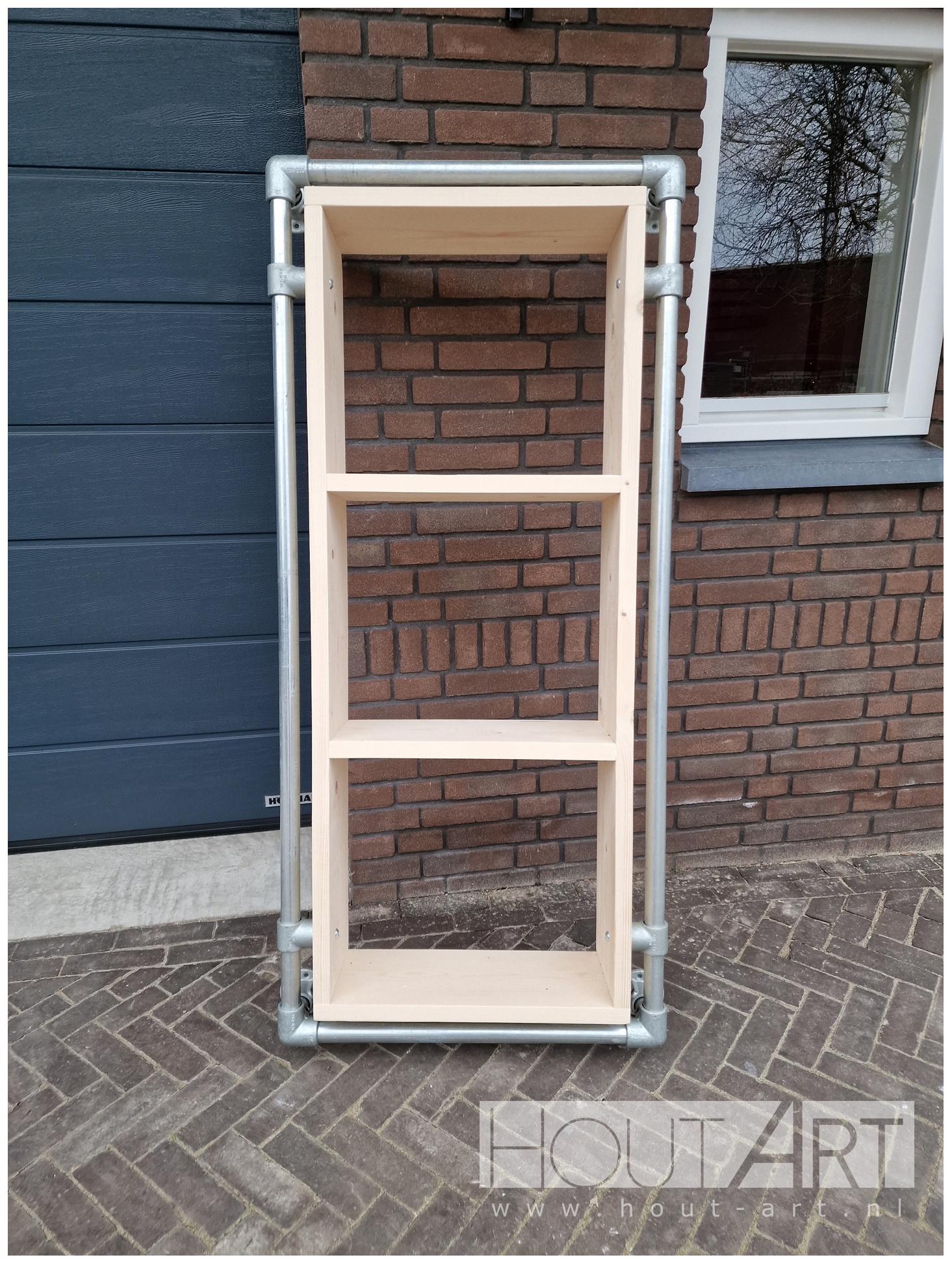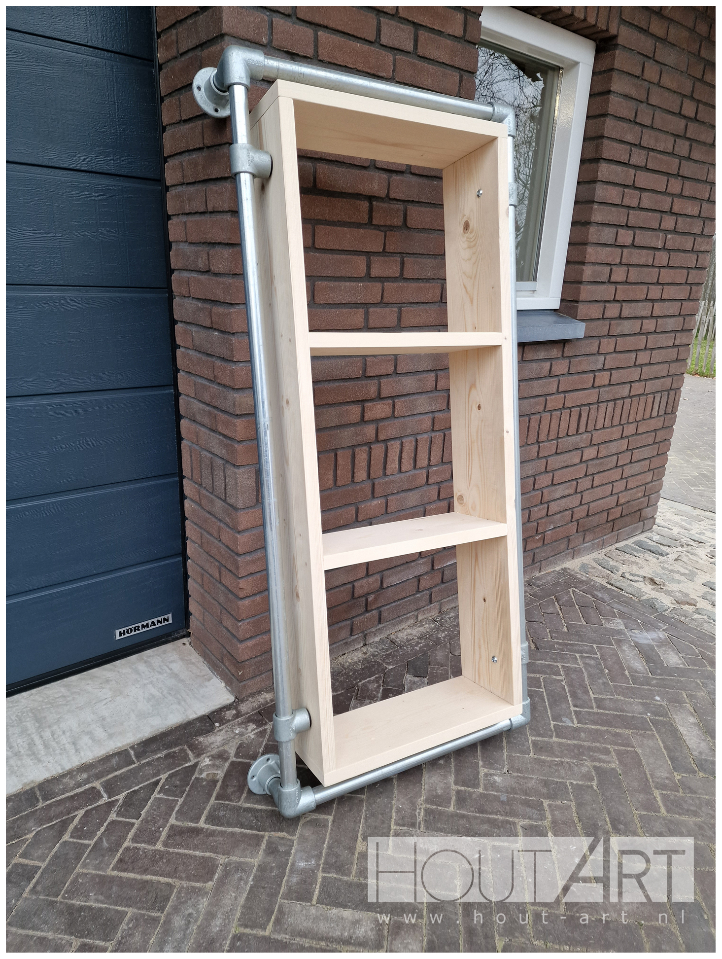 Hangende kast steigerbuis met legplanken steigerhout