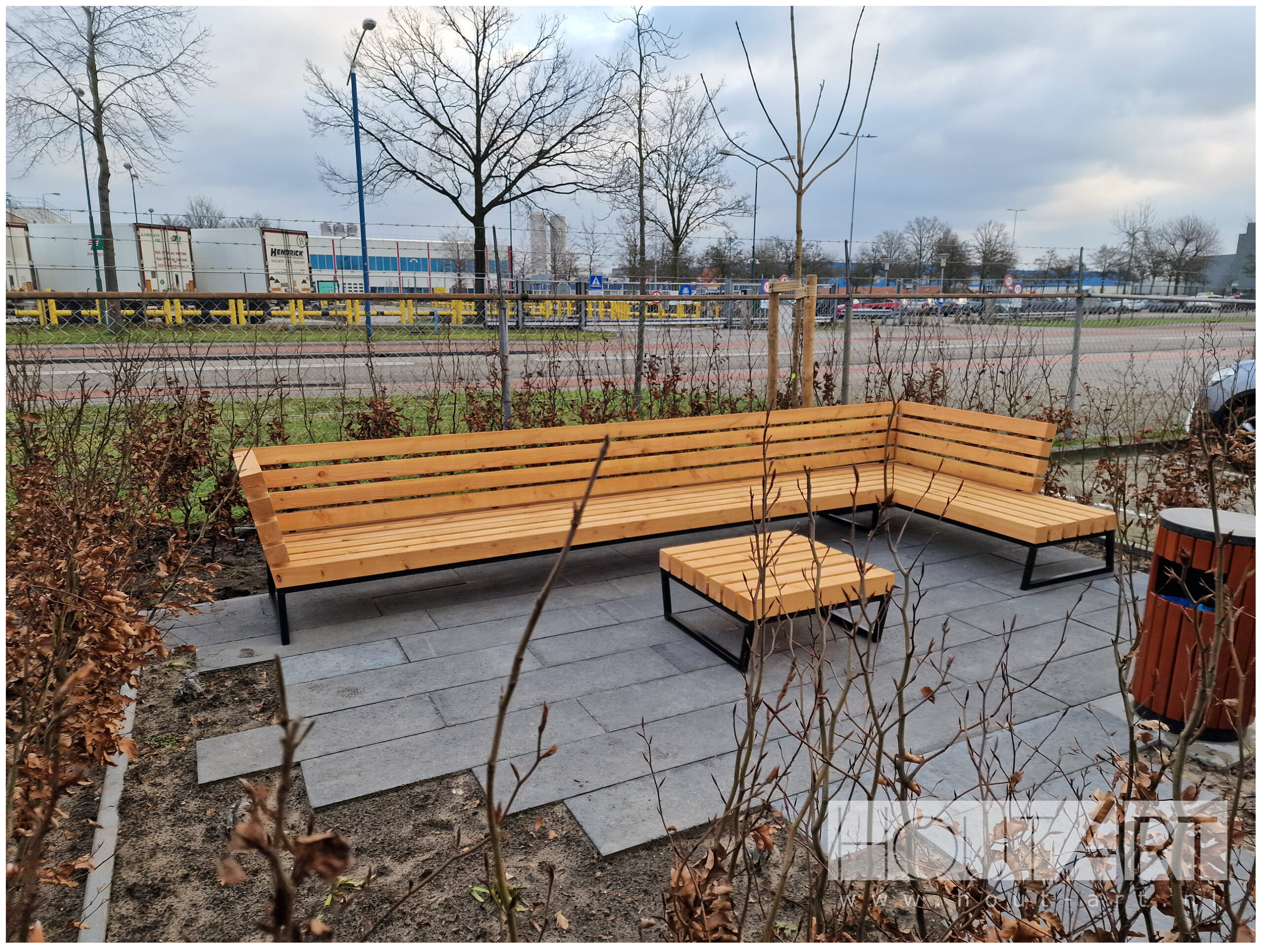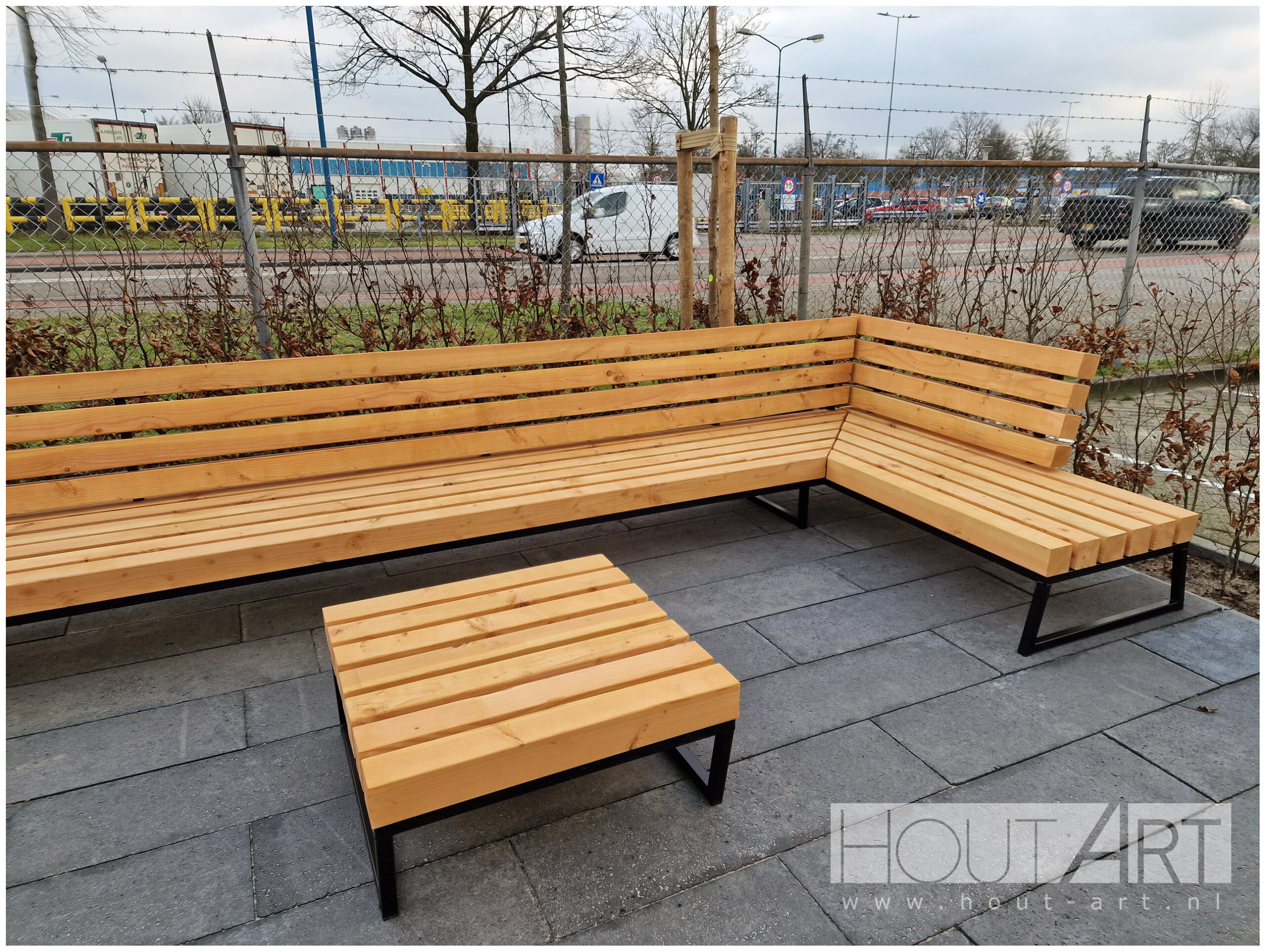 Hoek loungebank Massive doorlopende rugleuning/chaise lounge staal met douglas balken