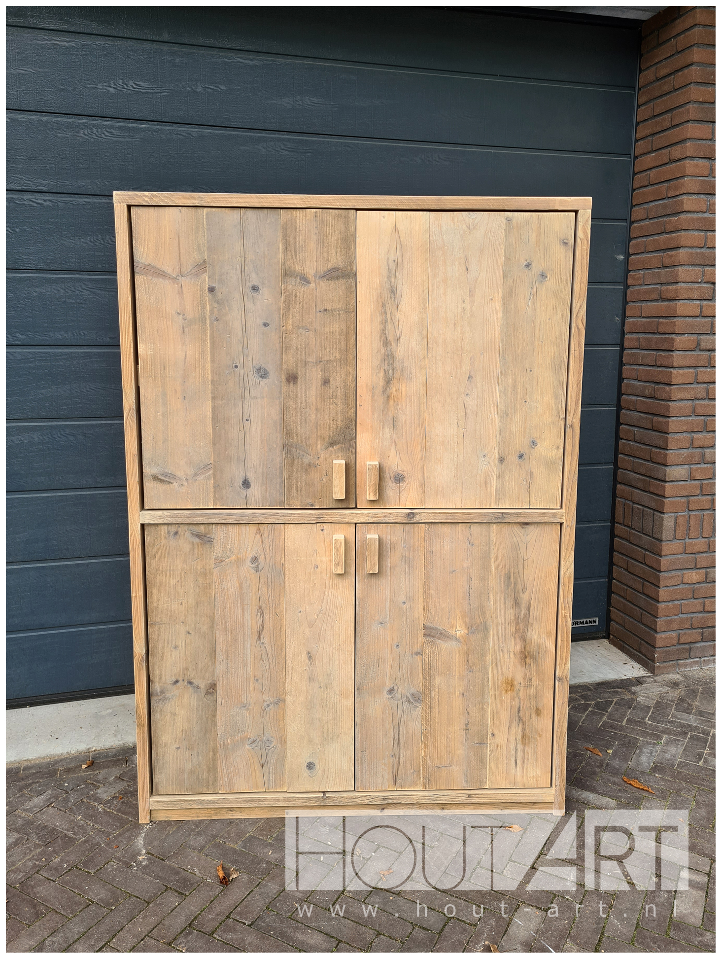 Een praktische en houten dichte kast van steigerhout, goed te gebruiken voor in de woonkamer maar bijvoorbeeld ook geschikt voor de studeer- of werkkamer. De kast is in verschillende afmetingen en opties mogelijk, kies daarbij de handgrepen, de behandeling van het hout en een waterafstotende coating voor de beste bescherming van het hout.