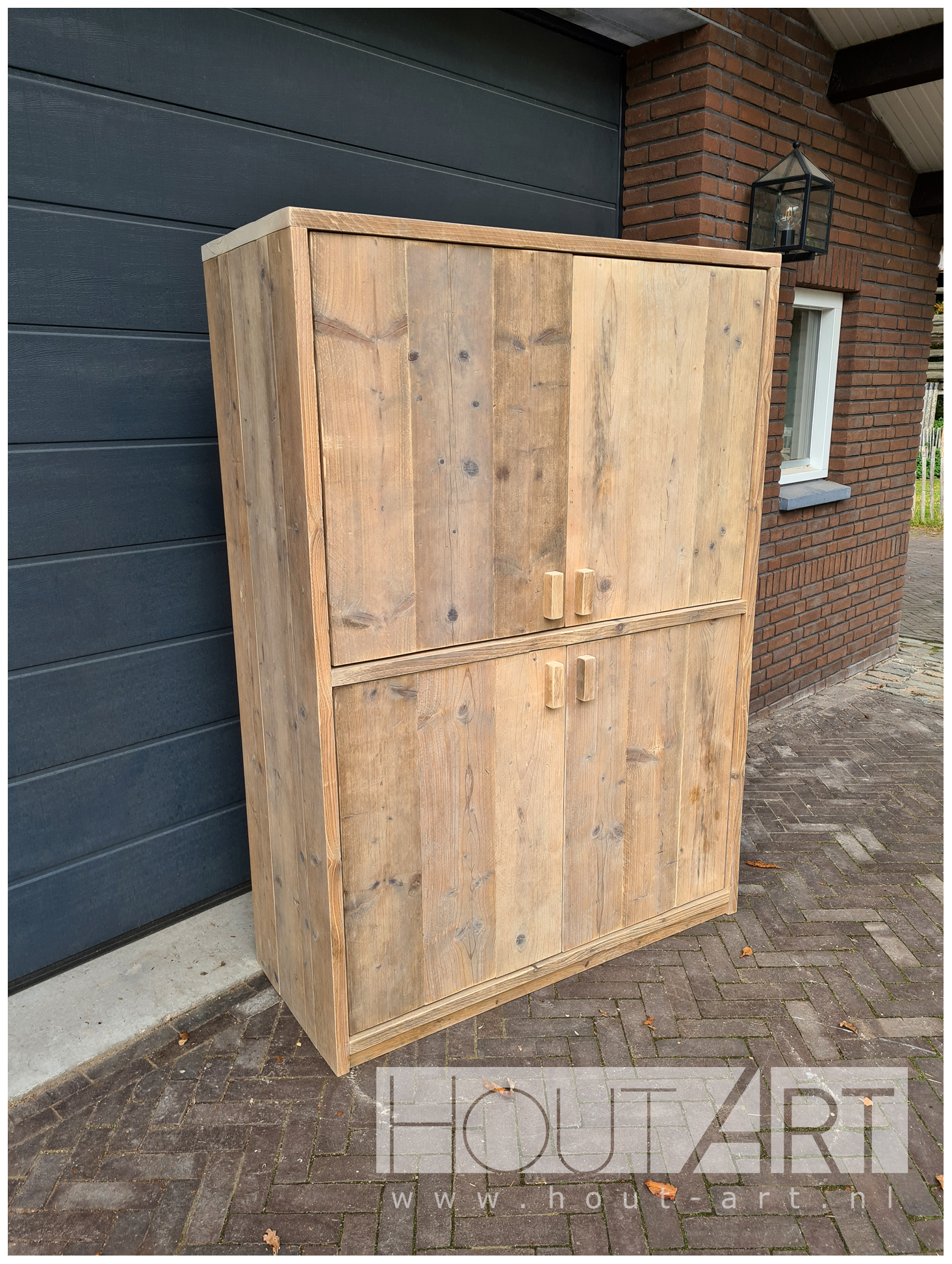 Met deze kast haal je direct genoeg opbergruimte in huis, achter de vier deuren zit een legplank van stevig multiplex. Waarin je boeken en andere spullen kunt opbergen. Je kunt bij deze kast kiezen uit nieuw of gebruikt steigerhout, met gebruikt hout krijgt je meubel een robuustere uitstraling. Daarnaast is dit meubel goed te combineren met onze andere steigerhouten meubels, zoals: bureaus, wandplanken en kapstokken. Zo creëer je een samenhangend en stijlvol interieur.