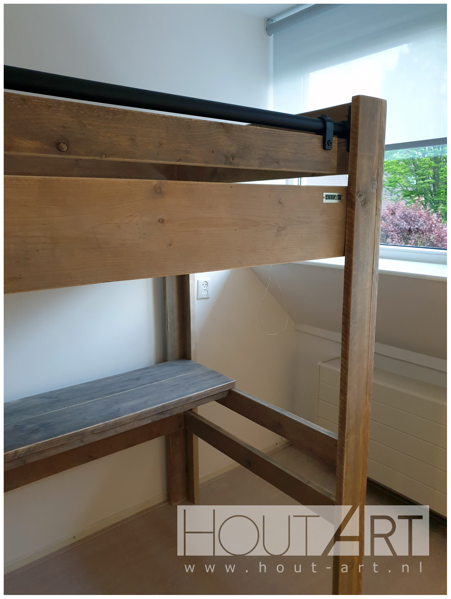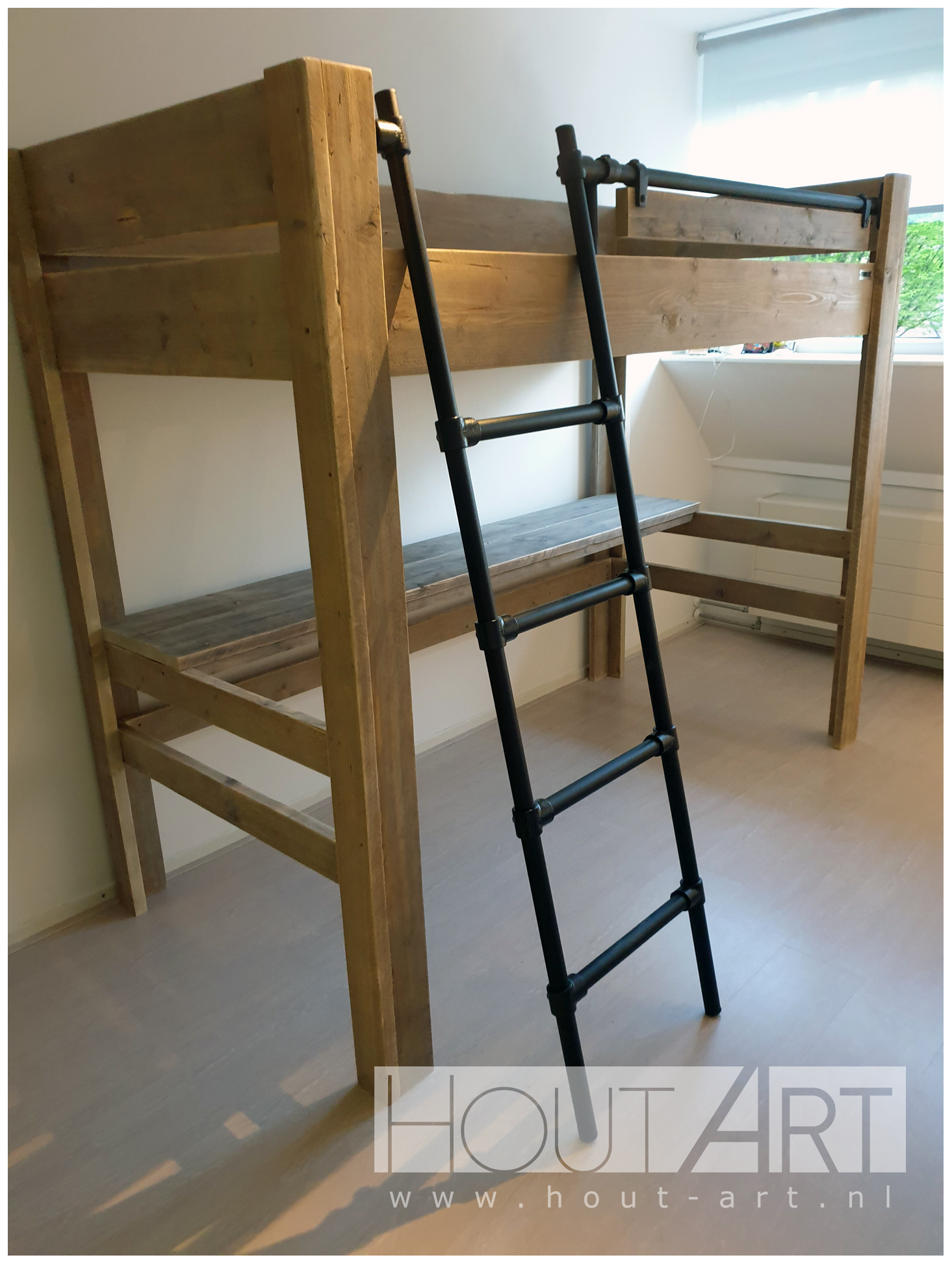 Hoogslaper steigerhout met zwarte steigerbuistrap