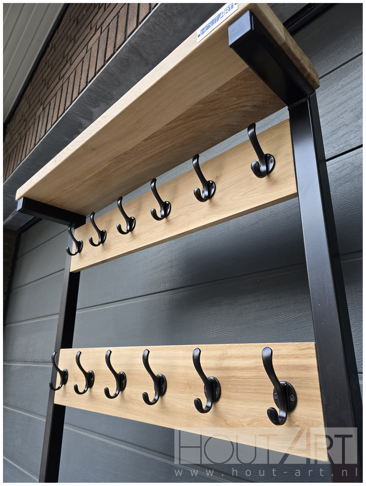 Deze industriële kapstok is gemaakt van stalen frame in koker 40x40mm met daarbij nieuw eiken of kies voor de karakteristieke oud eiken spoorbielzen. Kies bij deze kapstok het type haak, ga voor industrieel met het gladde bouthaakje, of voor een luxere uitstraling kun je kiezen uit drie verschillende haken. Bij deze kapstok heb je één of meerde schoenenplanken en een kinderkapstok. Deze kapstok is naar je eigen wensen samen te stellen, kies daarbij de afmetingen en de kleur van het frame.