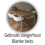Gebruikt steigerhout is als basis vergrijsd bruin van kleur. Een blanke beits bij gebruikt steigerhout gaat elke plank versterken en wat meer contract geven, de oorspronkelijke kleur van het hout komt wat meer naar voren, waardoor het meubel hierdoor wat bruiner en warmer van kleur wordt, maar ook een iets vlekkerig en geleefdere uitstraling krijgt omdat elke plank wat anders kan worden.