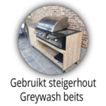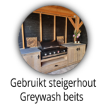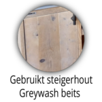 Gebruikt steigerhout is als basis vergrijsd bruin van kleur. Met een greywash beits willen we zoveel mogelijk deze natuurlijke vergrijsd bruine kleur behouden. Door de greywash beits wordt het hout iets egaler grijs van kleur, waardoor je een hele mooie natuurlijke kleur krijgt.