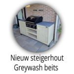 Een greywash beits bij nieuw steigerhout geeft een lichte grijze kleur op het meubel. De greywash beits is transparant. Met een blanke houtkleur als basis krijg je met de greywash dan ook een lichte grijze kleur, waardoor de houtstructuur nog goed zichtbaar is.