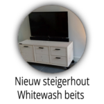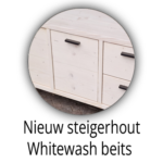 Een whitewash beits bij nieuw steigerhout geeft een mooie witte kleur op het meubel, maar nog steeds met behoud van de houtstructuur. De whitewash beits is transparant, maar doordat deze altijd in 2 lagen wordt aangebracht en de basiskleur van het hout vrij licht is krijg je echt een mooie transparant witte kleur.