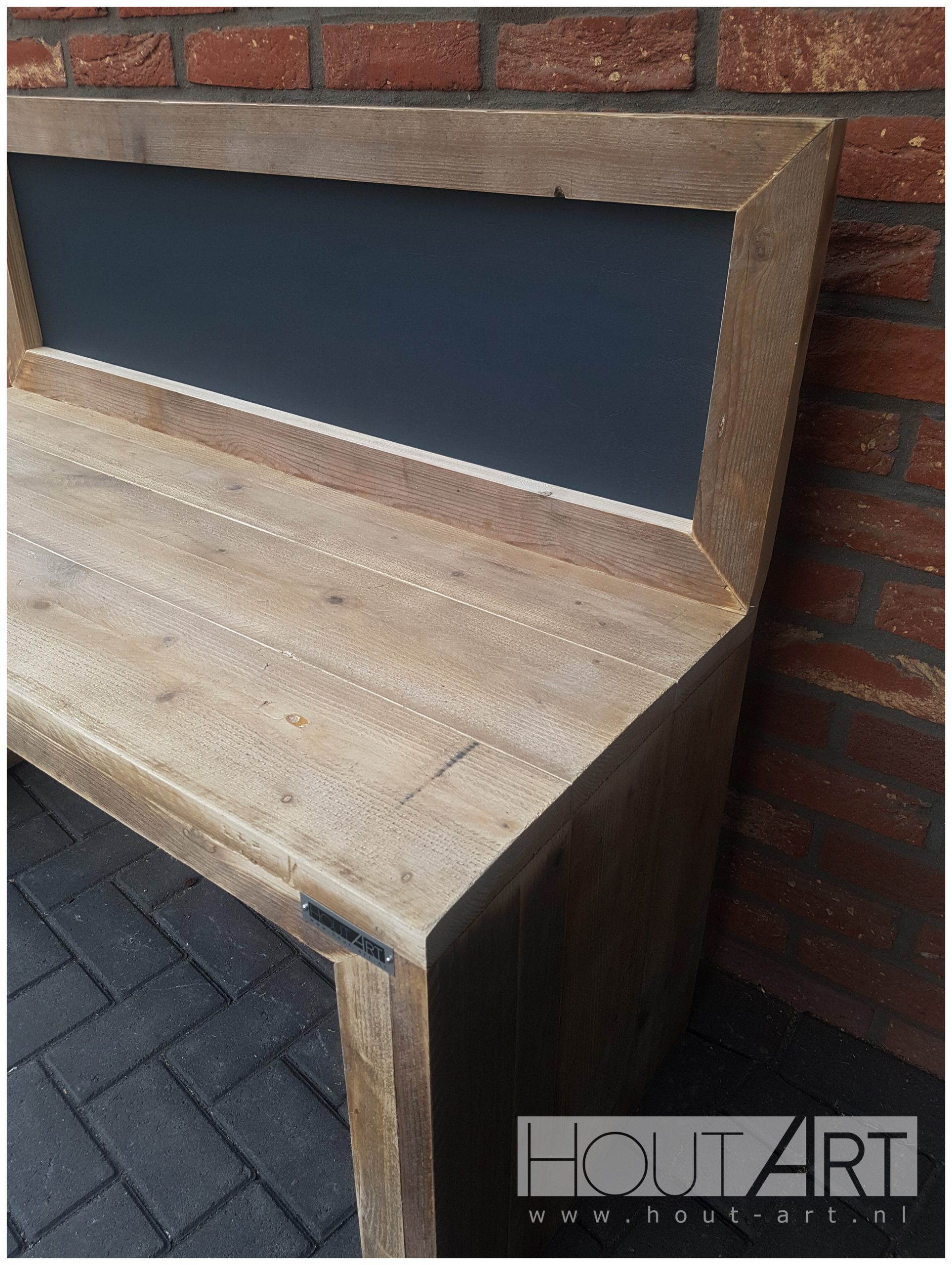 De achterwand heeft een rand van steigerhout met daarin een krijtbord /schoolbord, geschilderd in mat zwart over de hele breedte.