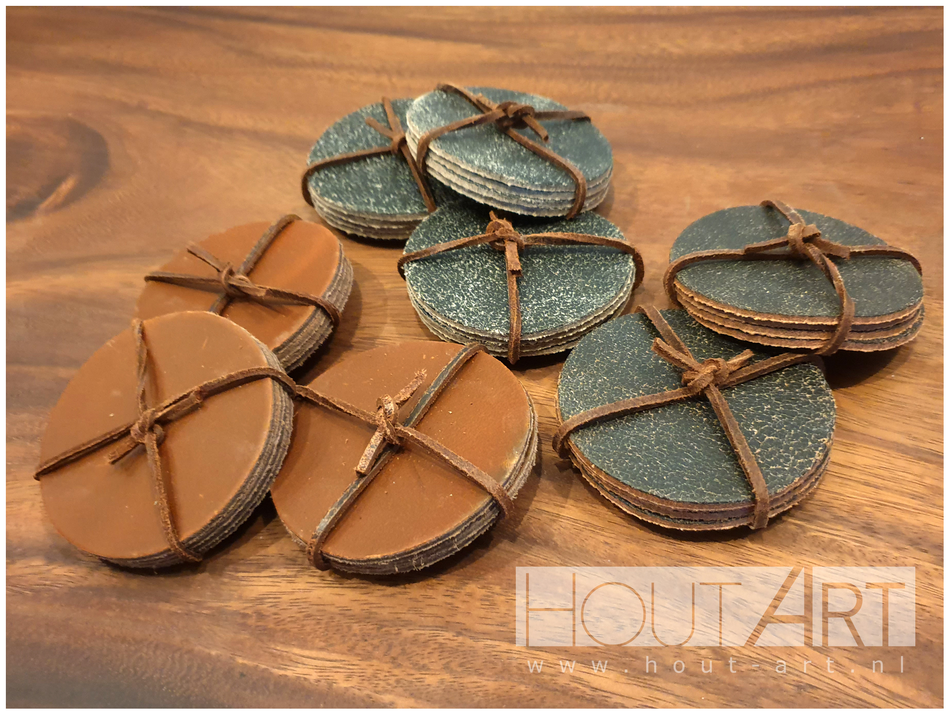 Set van vier stuks leren onderzetters, bij elkaar gebonden met een leren touwtje.