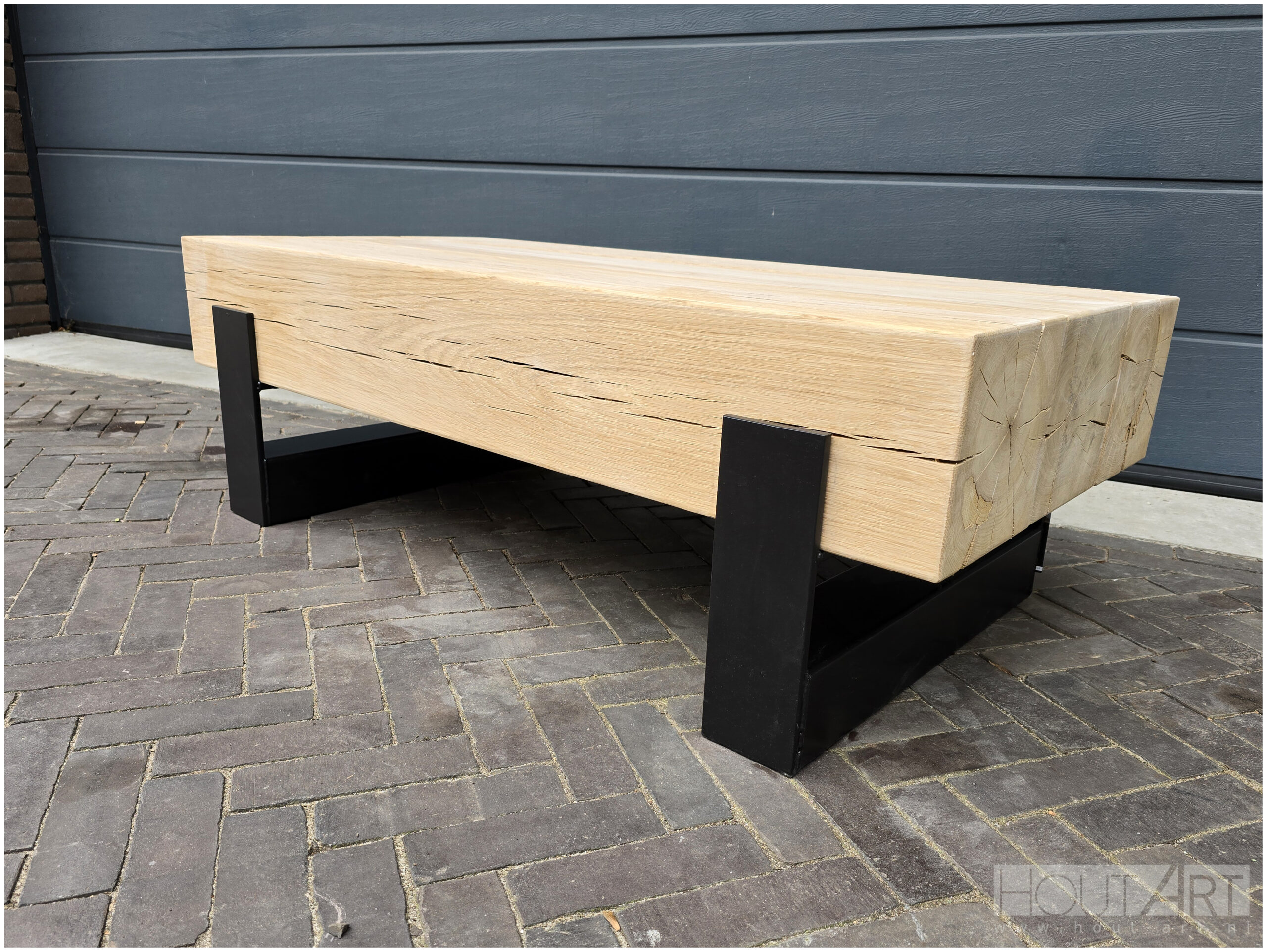 Super stoer en robuust, deze salontafel gemaakt van eiken balken en stalen poten in koker 6x6cm, 8x8cm of 10x10cm met een open gedeelte tussen de koker en de balk. Standaard hoogte is 35cm, maar ook mogelijk in 40cm. Kortom, een echte eyecatcher in je interieur! Het geeft je woonkamer een robuuste en industriële uitstraling.