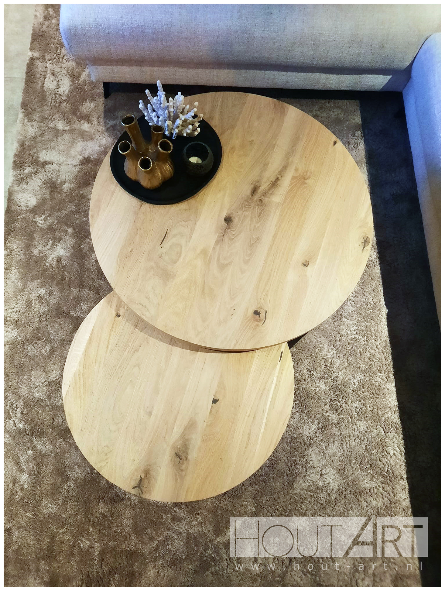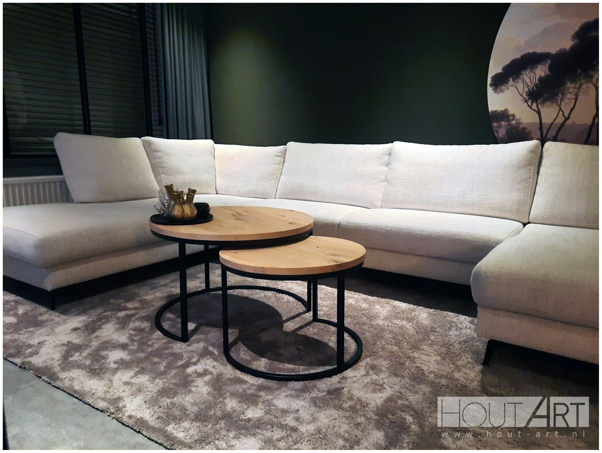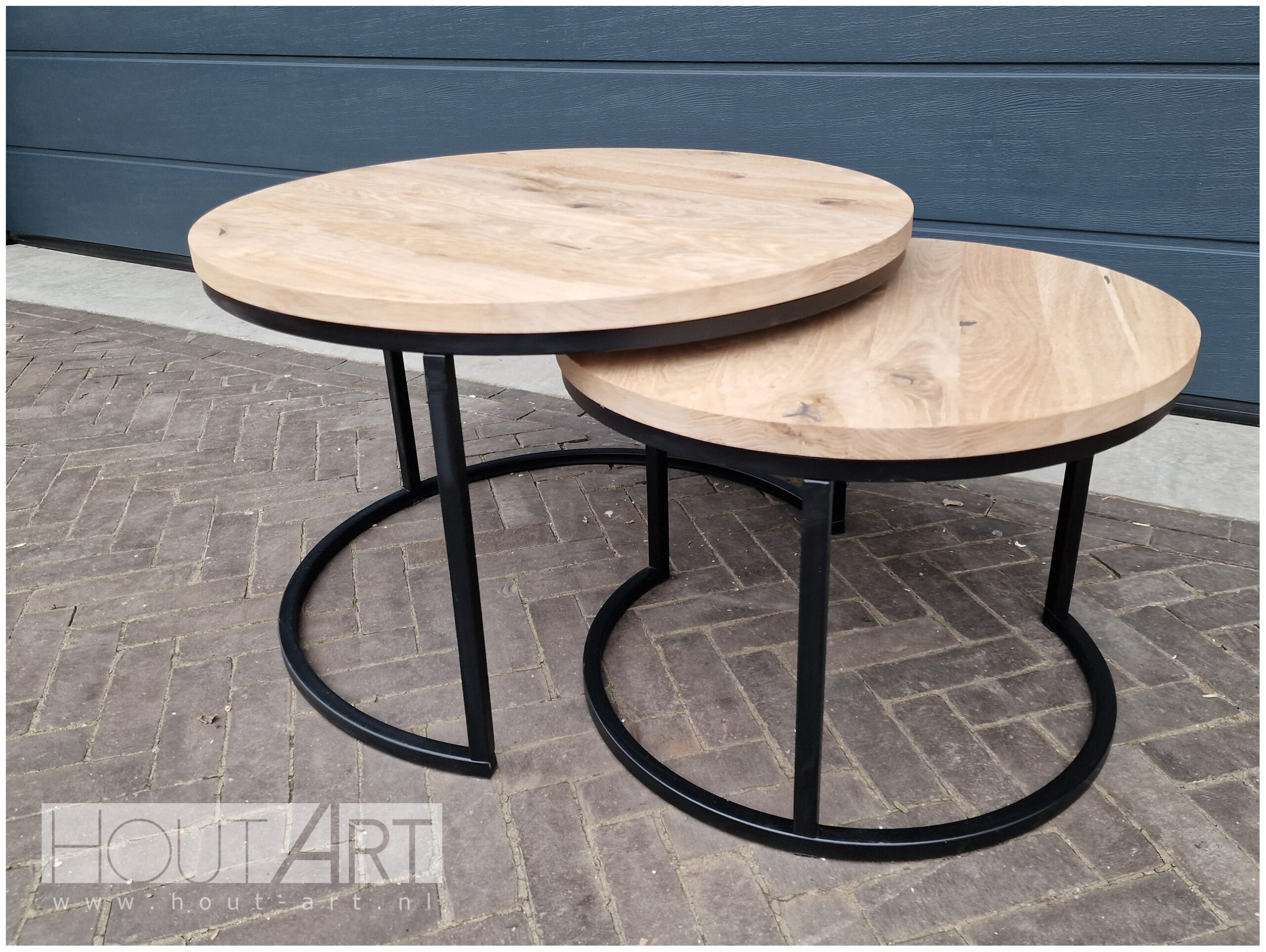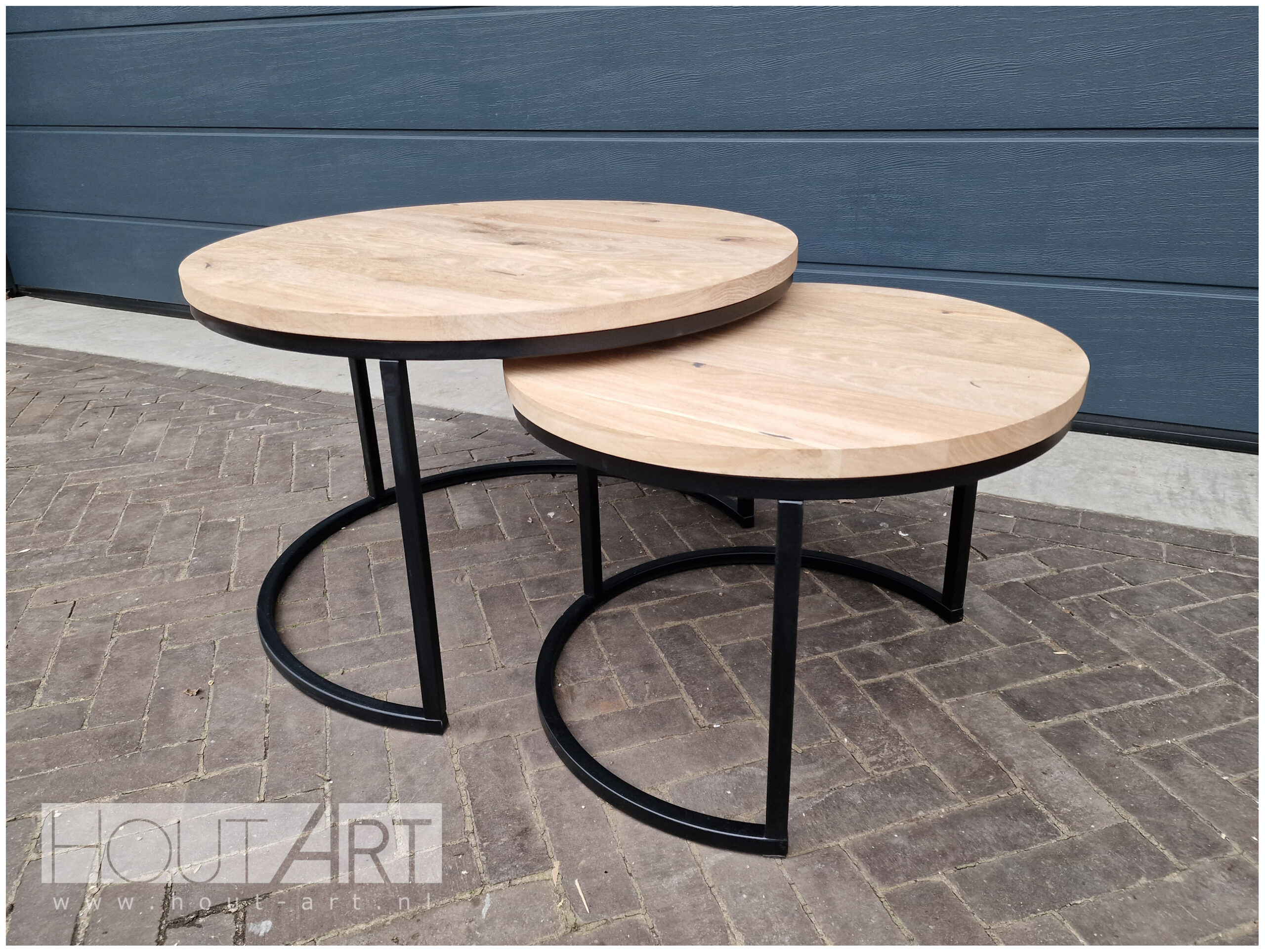 Deze industriële ronde salontafel set, van twee stuks met gebogen stalen frame, zijn gemaakt met een fijne zwarte structuur poedercoating en verkrijgbaar in één maat. Het blad is in massief eiken van 25mm. Je kunt ze makkelijk onder elkaar schuiven maar ook naast elkaar zetten.