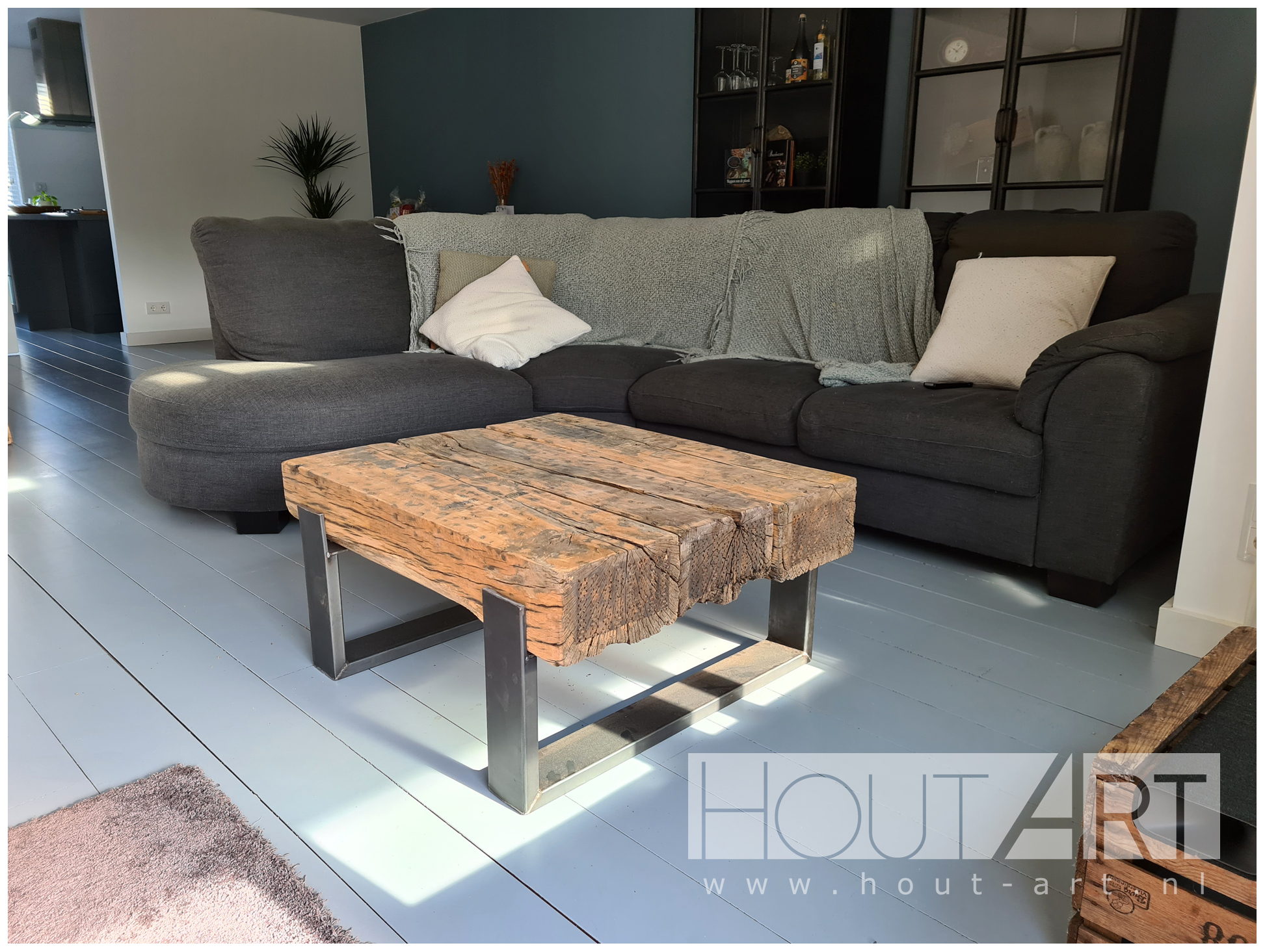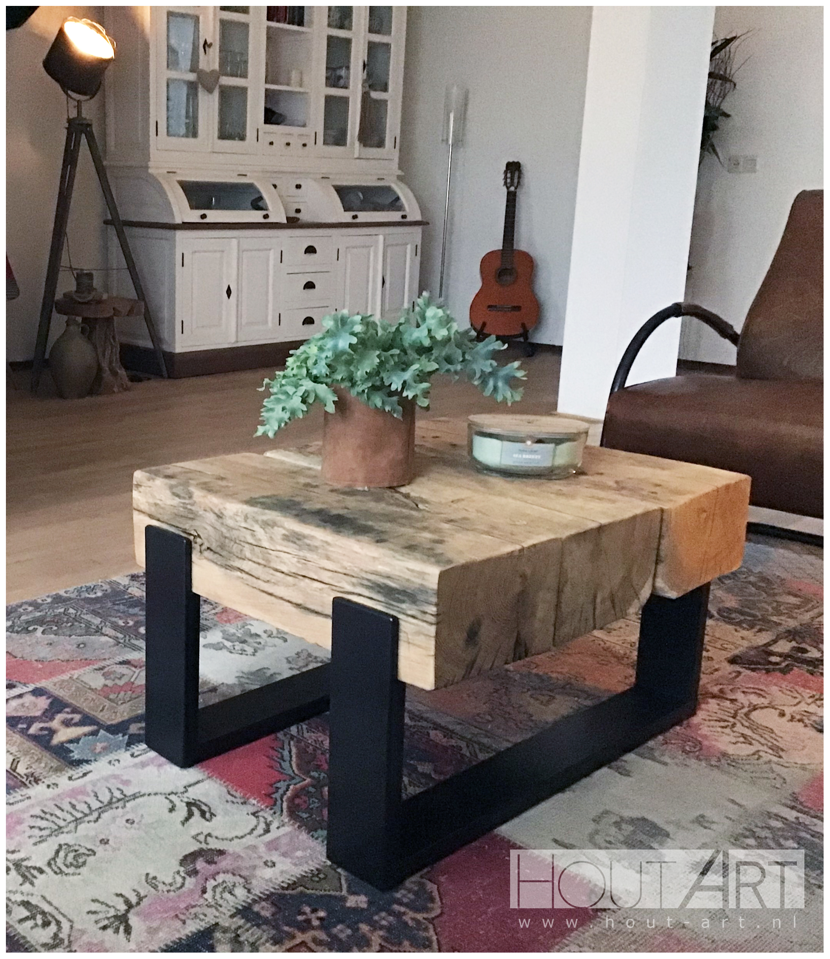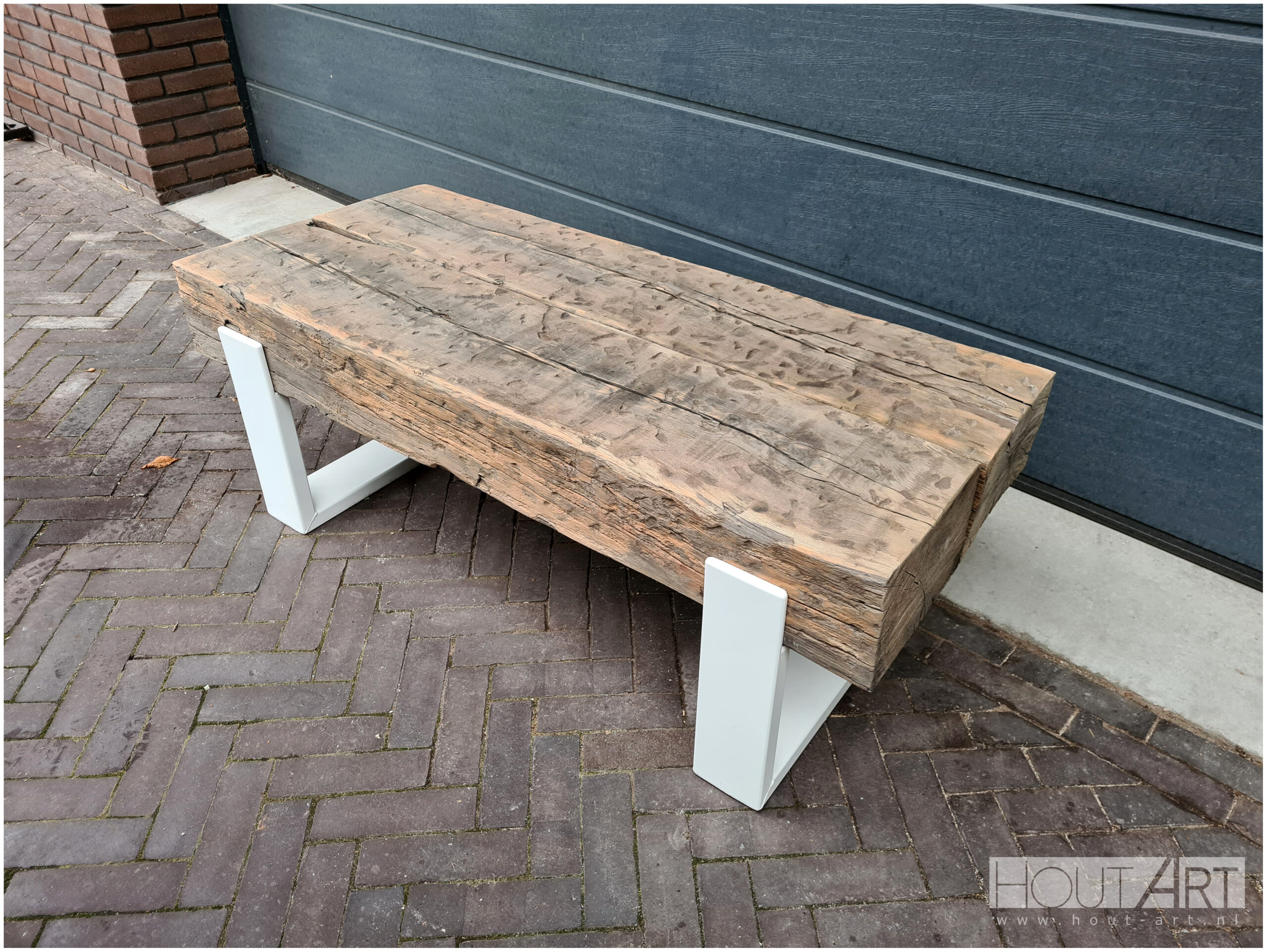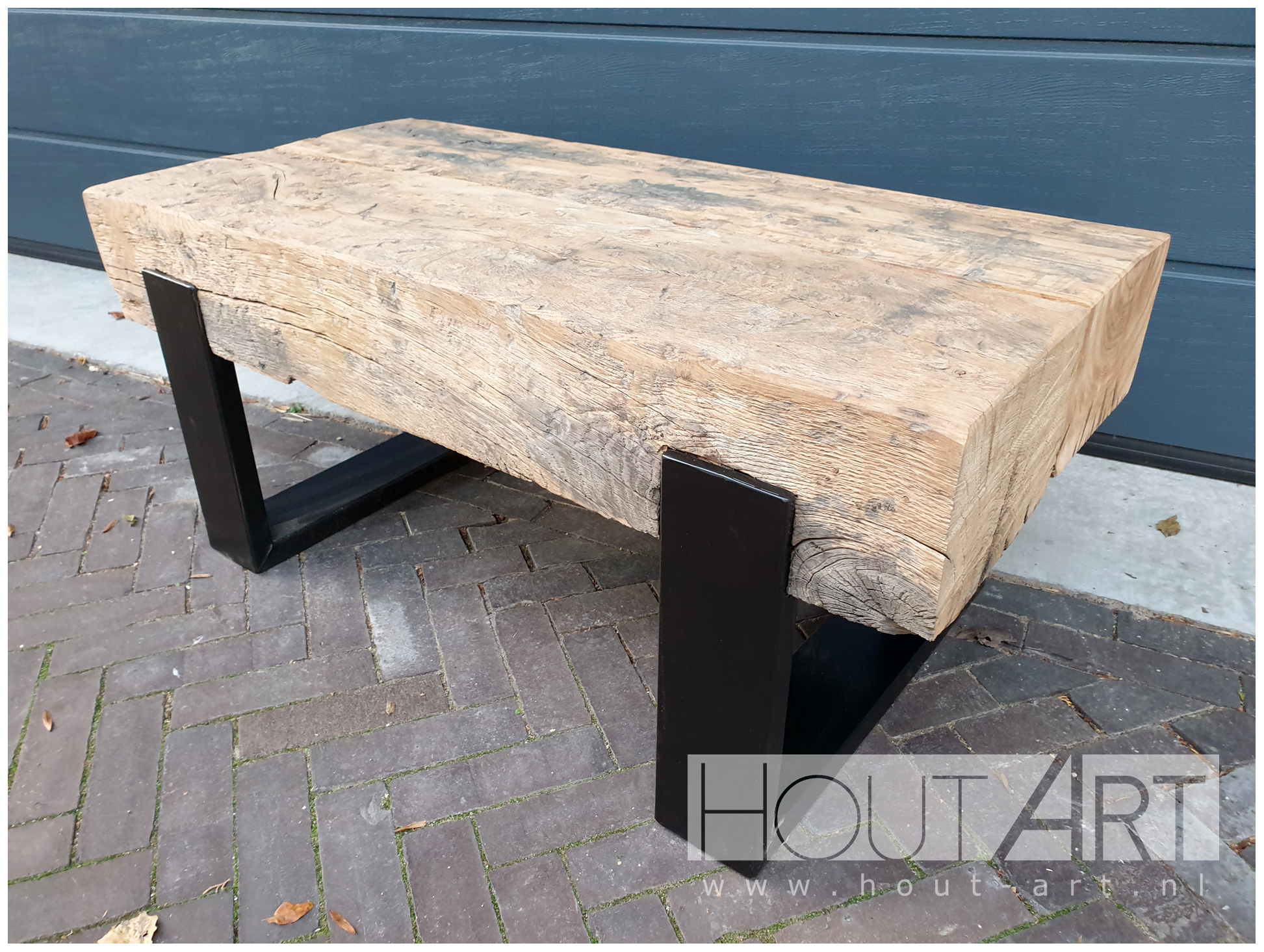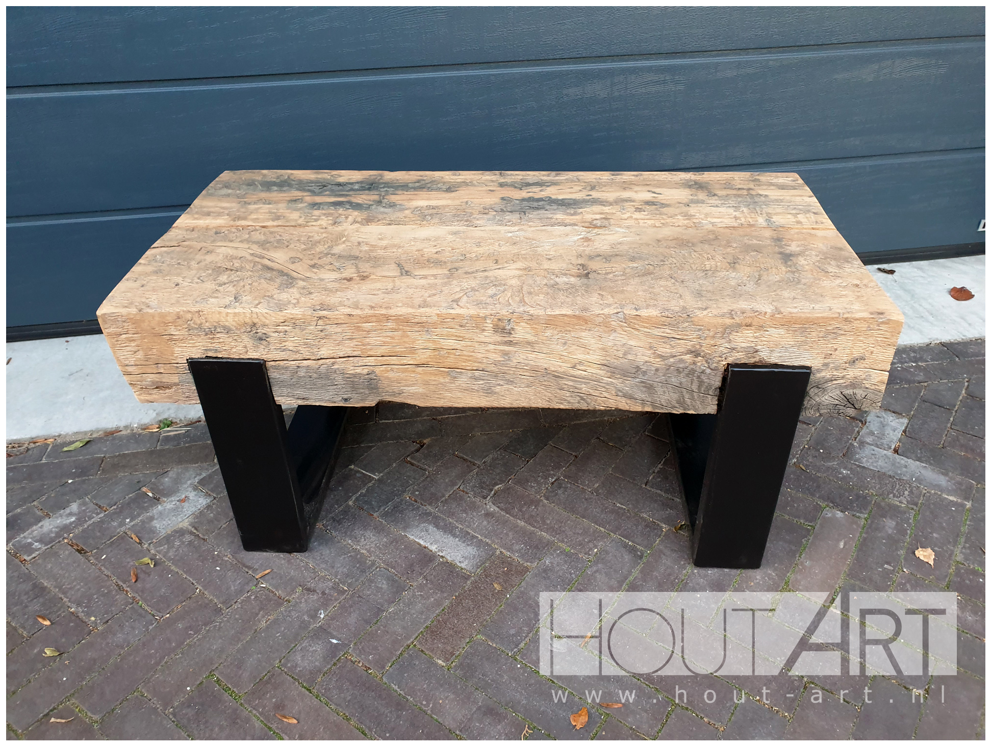 Salontafel stalen u-poot met oud eiken spoorbiels