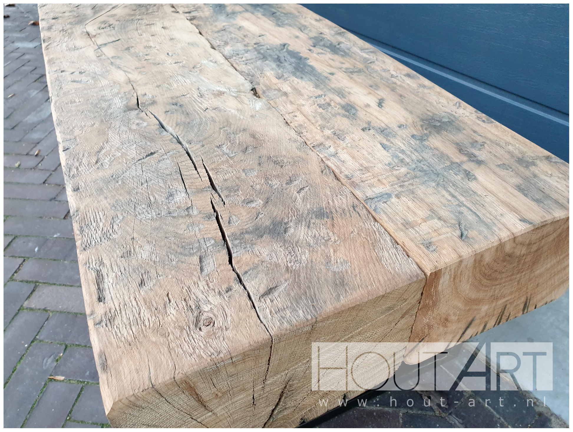 Oude steigerplanken zijn grijzig door het cement wat er overheen is gegaan en door de bewerking van het weer. De planken welke wij gebruiken zijn allemaal anderhalf tot twee jaar in weer en wind gebruikt, uit gesorteerd en na gebruik een ruim half jaar gedroogd om eventuele werking zoveel mogelijk te voorkomen als mogelijk.