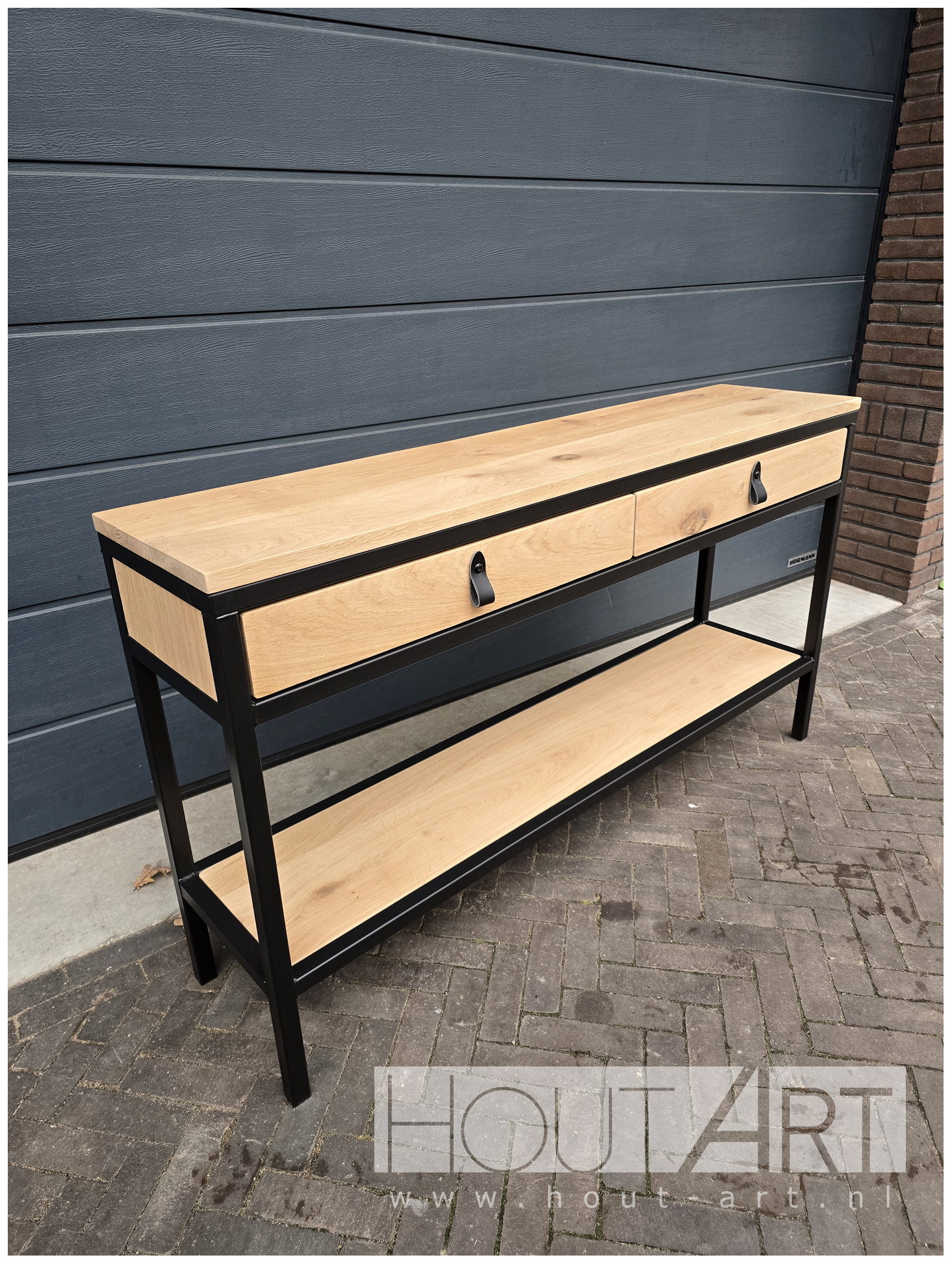 Een mooie toevoeging aan je interieur, deze luxe en industriële sidetable, gemaakt met een stalen frame en eiken. Het geeft je ruimte een industriële en chique uitstraling. Praktisch in gebruik met één of twee lades en onderblad, afhankelijk van de afmeting. Kies daarbij het type handgreep van eiken, staal of leer.