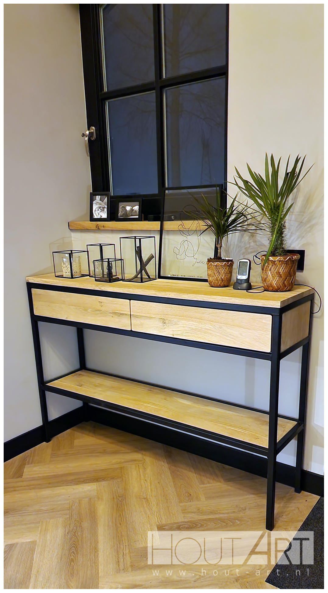 Sidetable stalen frame met lade(s) en legplank eiken
