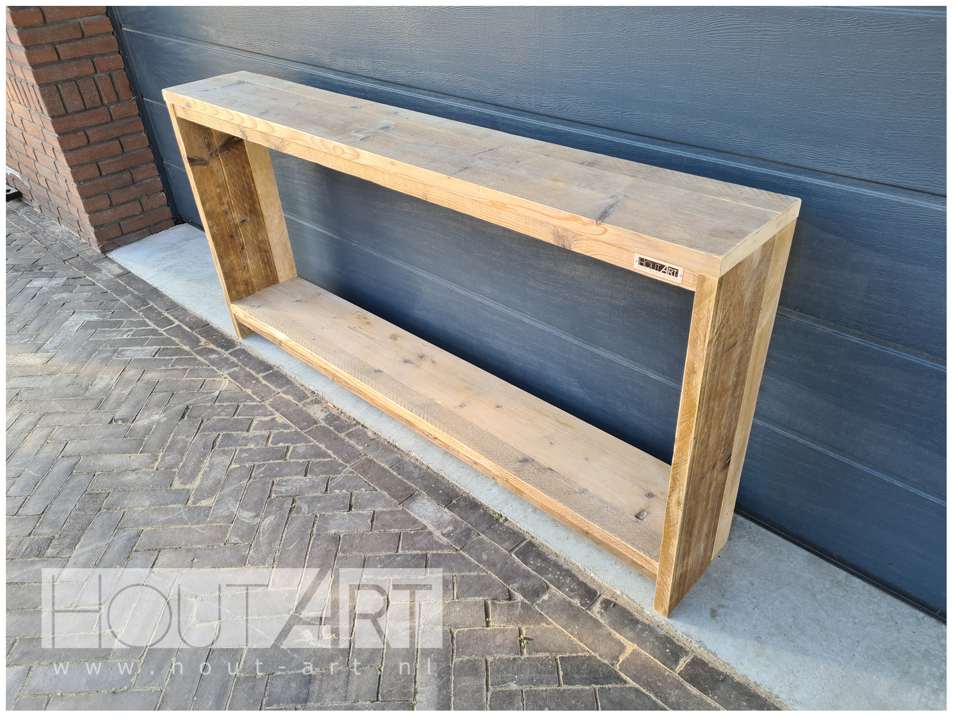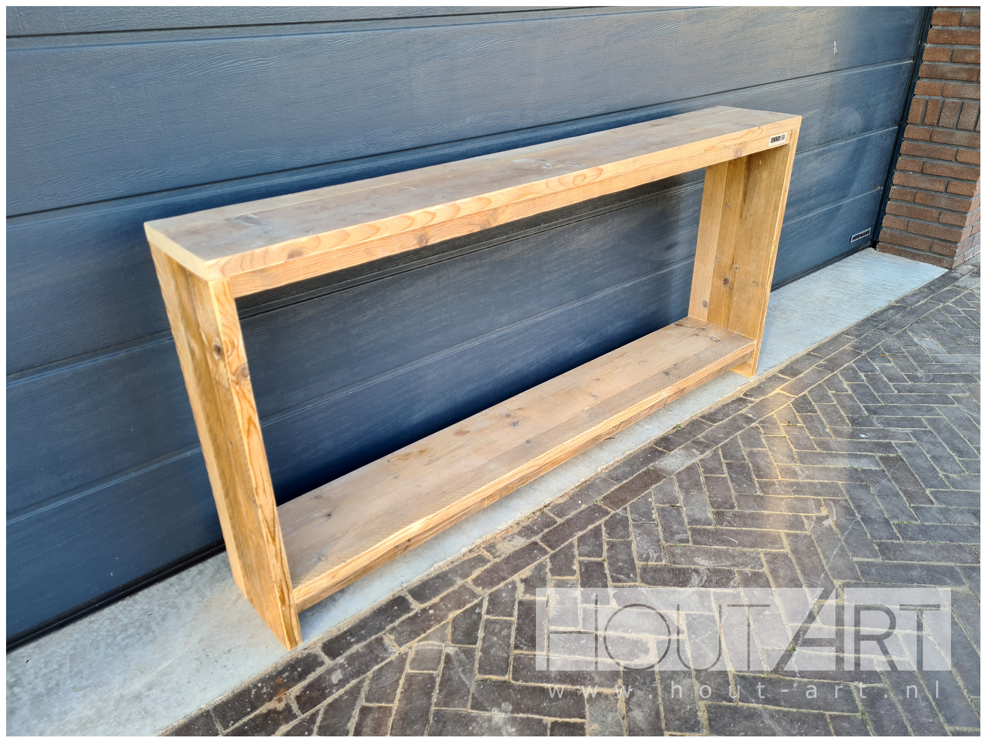 Een leuk meubel wat je kunt neerzetten tegen die lege muur, of achter de bank. Maak het af met mooie decoratie, een lamp, plant of vaas. Dit meubel is helemaal naar eigen wensen samen te stellen, kies daarbij de afmetingen en de behandeling van het hout. Combineer het met onze bijpassende meubels van steigerhout, zoals kasten, tafels en wandplanken.