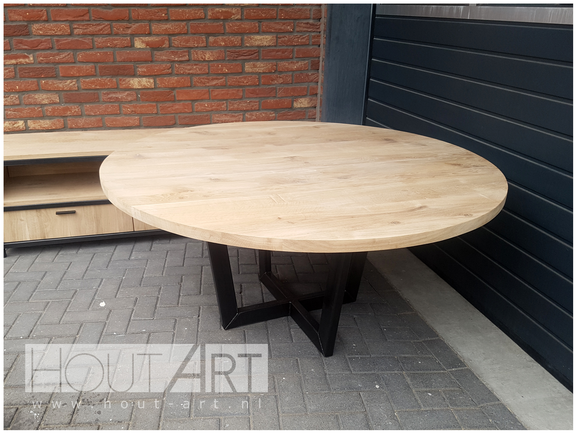 Met een ronde tafel, creëer je gezelligheid tijdens het eten. Deze tafel met omgekeerde trapeziumpoot is gemaakt uit stalen profielen van 8x4cm, en geven de tafel een industriële uitstraling. De zichtbare lassen geven het tafelonderstel een extra stoer en robuust karakter.