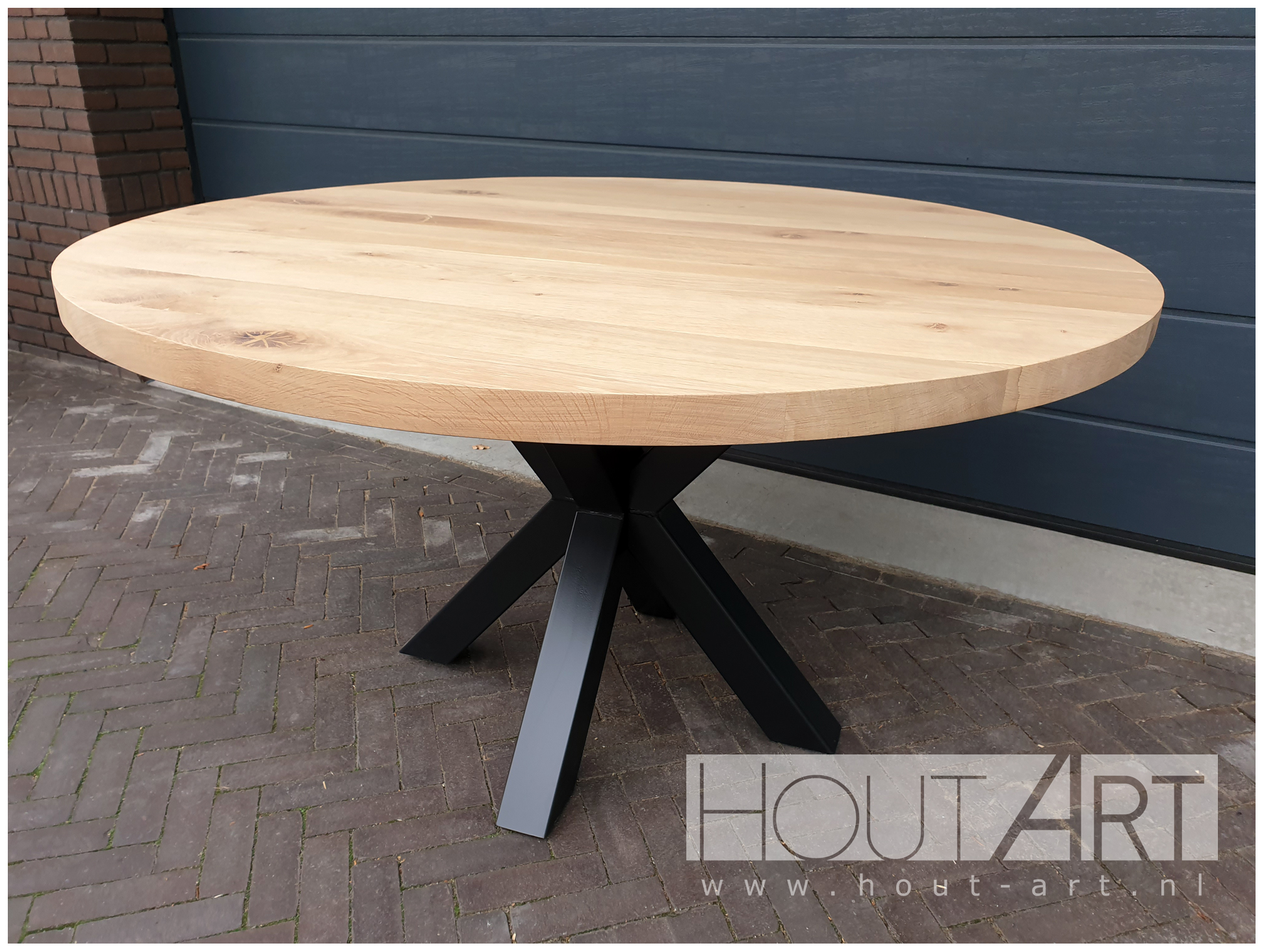 Tafel rond dubbele kruispoot staal met massief eiken