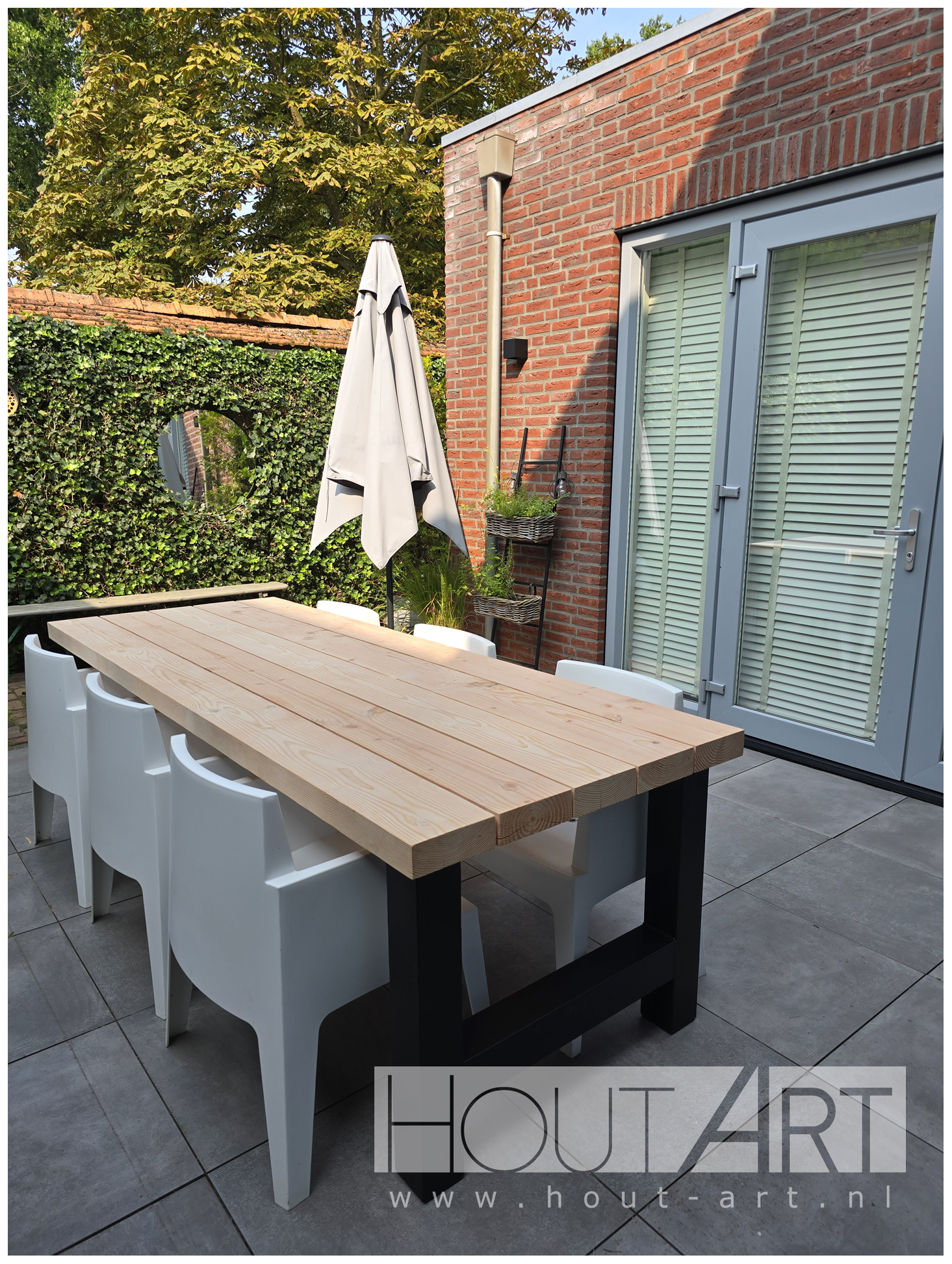 Dit meubel is in verschillende afmetingen en opties mogelijk, wij maken het op maat in onze werkplaats. Dit model is een perfecte tafel om buiten te gebruiken, combineer het met onze bijpassende douglas meubels, zoals loungebanken, stoelen en de picknickset. Ook leuk, combineer deze tafel met onze kunststof box stoelen.