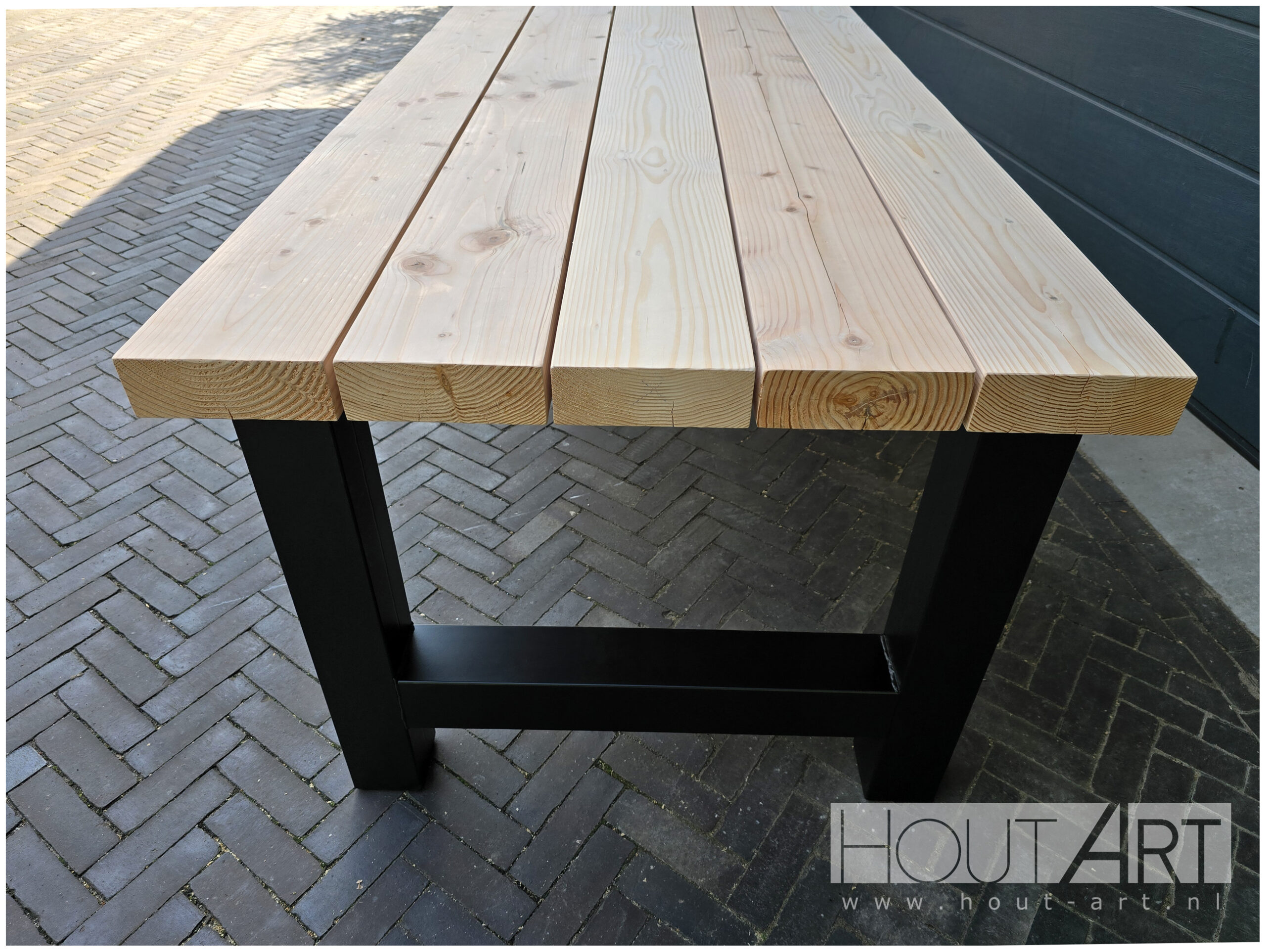 Deze industriële tafel, is gemaakt van een stalen H-poot, met blad in douglas balken. De tafel is gemaakt van dikwandige stalen kokers in 8x8cm of 10x10cm dikte voor een robuuster resultaat.