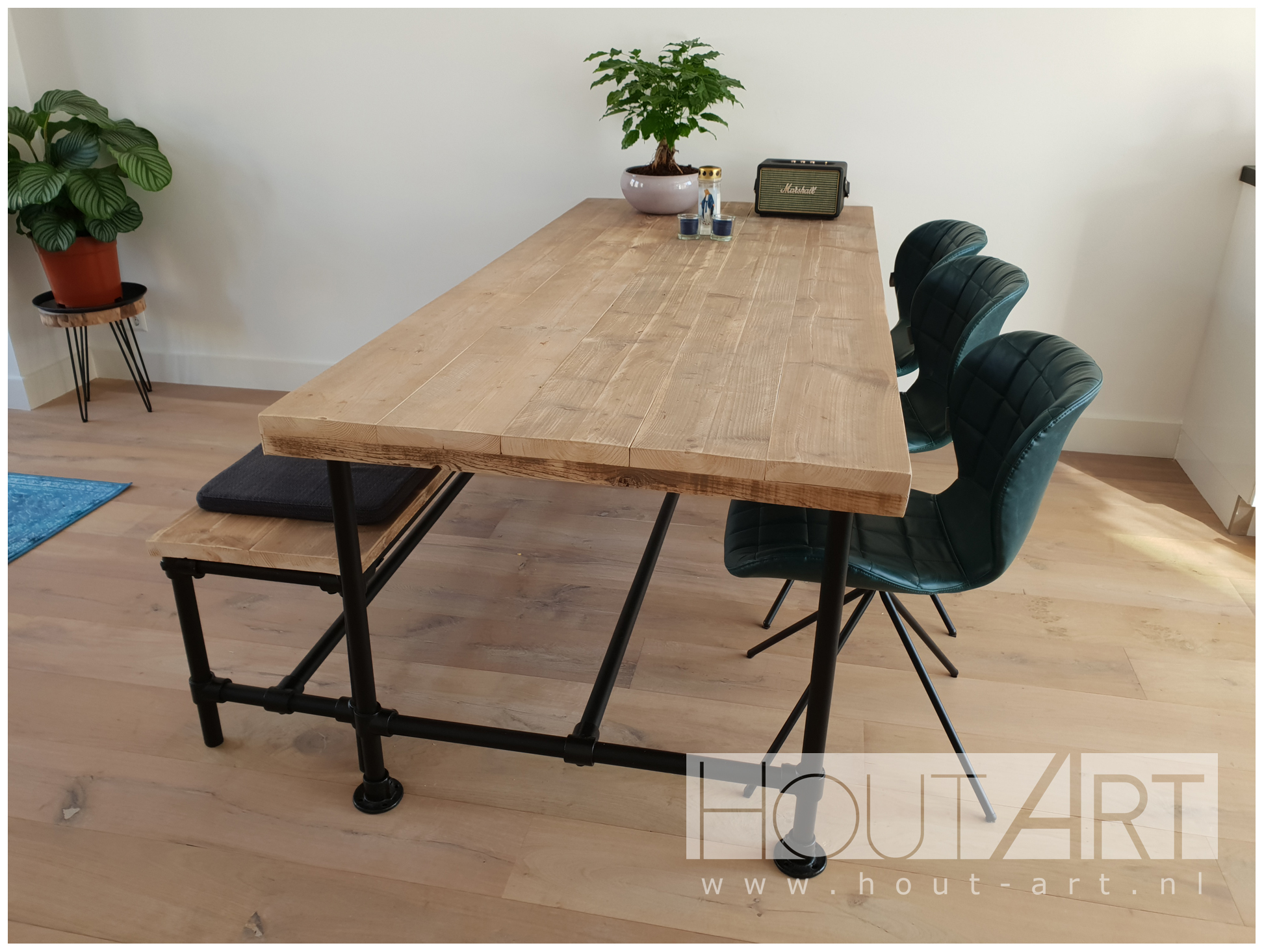 Gebruik deze eettafel in de woonkamer, maar het is ook een goede tafel voor in de horeca of in de bedrijfskantine. Dit meubel is in verschillende afmetingen en opties mogelijk, wij maken het op maat in onze werkplaats. Combineer het met onze bijpassende meubels van steigerhout, zoals salontafels, kasten en sidetables.