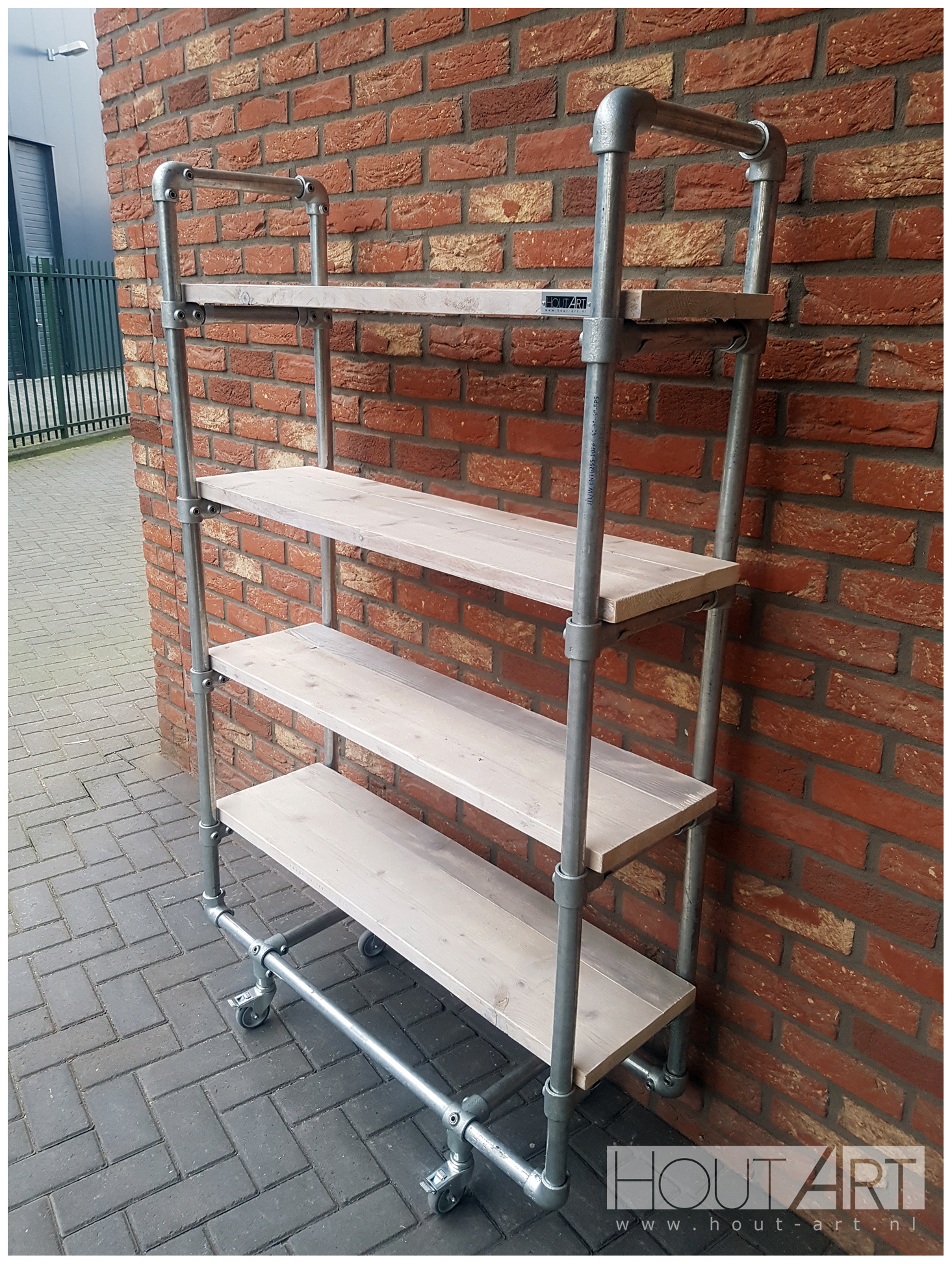Deze stellingkast heeft een aparte uitstraling en lijkt ook op een grote trolley kast. De kast heeft standaard vier legplanken waar diverse woonaccessoires, spullen in manden of mappen op geplaatst kunnen worden. Als optie kun je ook kiezen voor vijf of zes legplanken. De legplanken worden gemaakt in nieuw of gebruikt steigerhout, met gebruikt hout krijgt je meubel een robuustere look. Het frame wordt gemaakt van verzinkte steigerbuis, dit staat stevig als een huis! Kies je voor de wielen dan is deze kast makkelijk te verplaatsen.