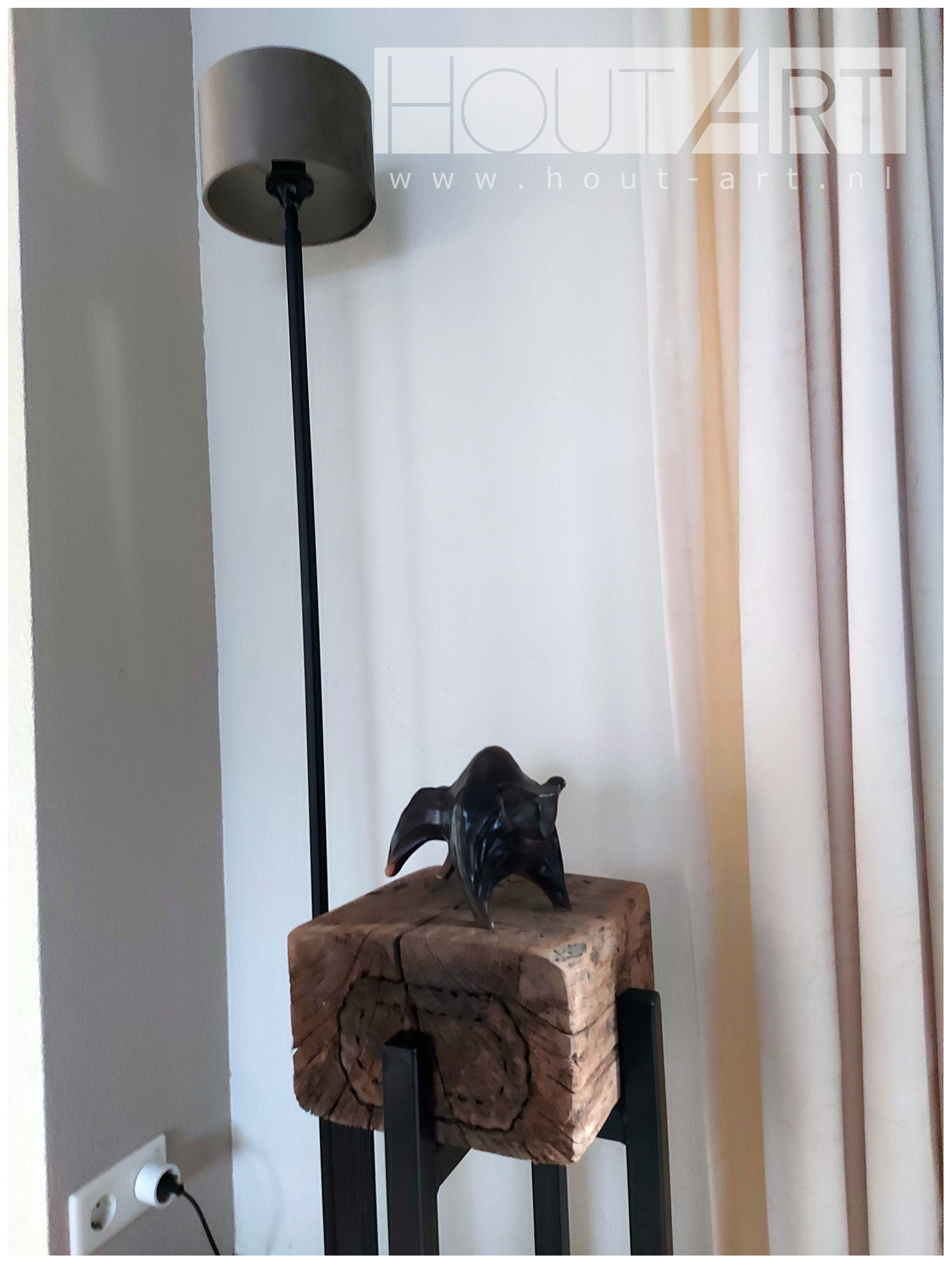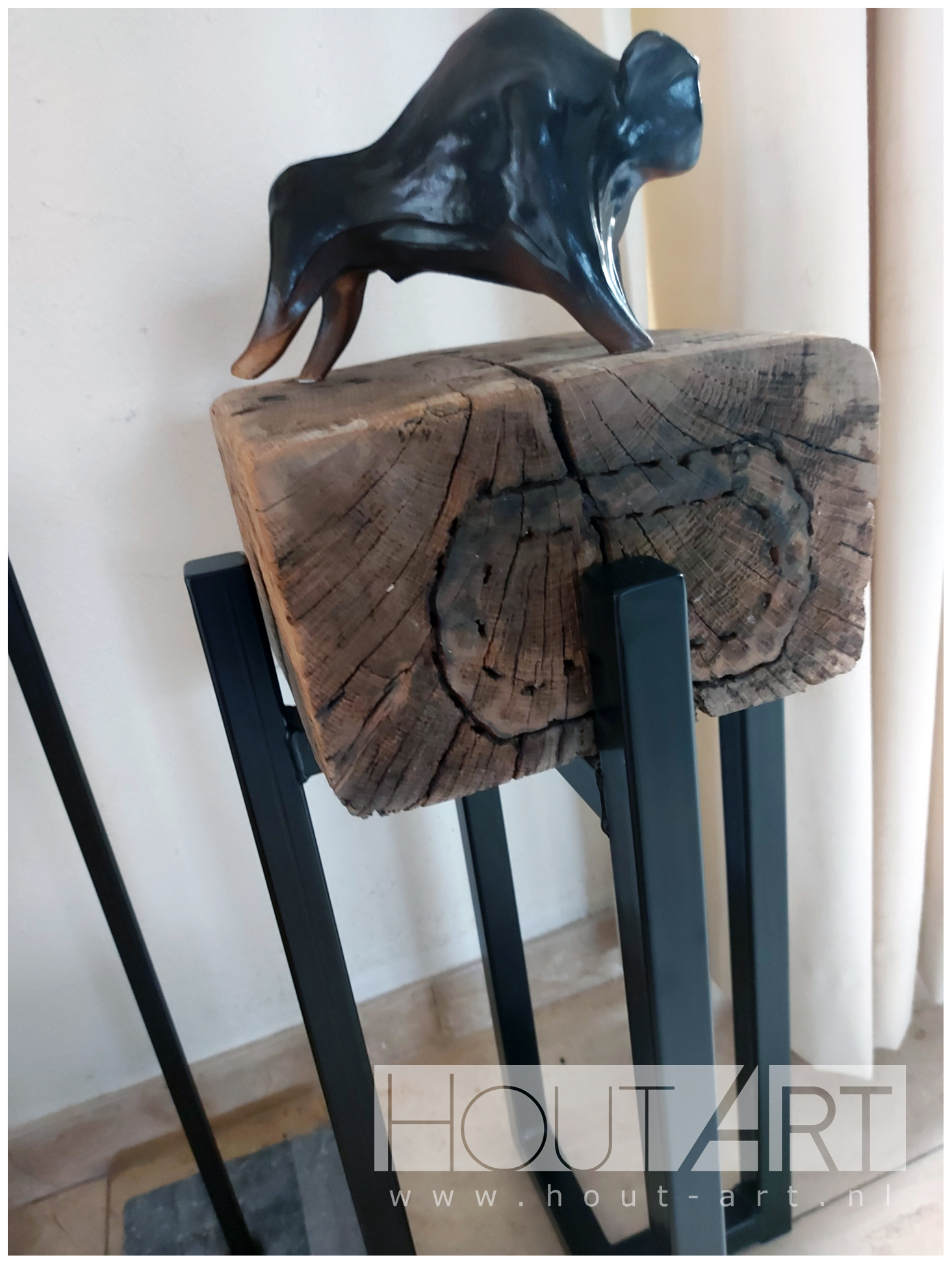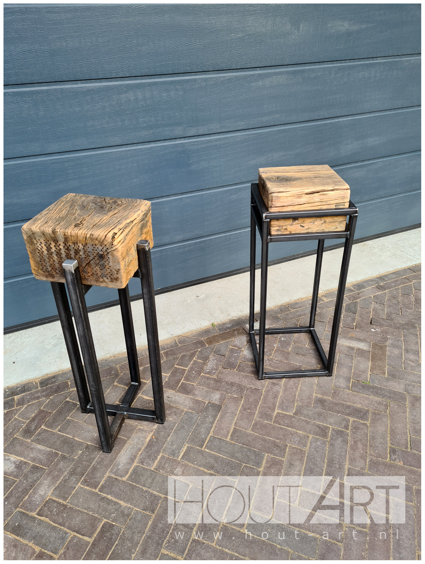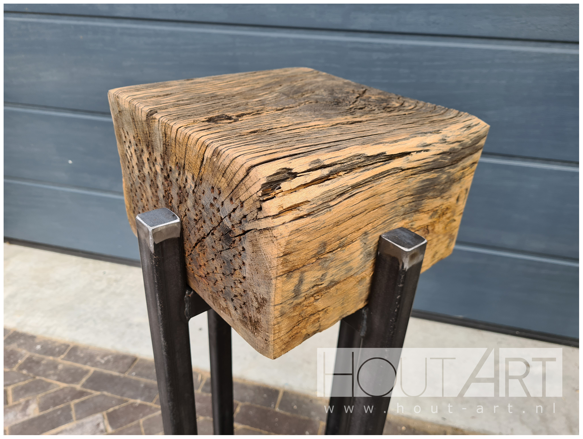 Mooie en industriële zuil / sokkel, gemaakt van staal en oud eiken.